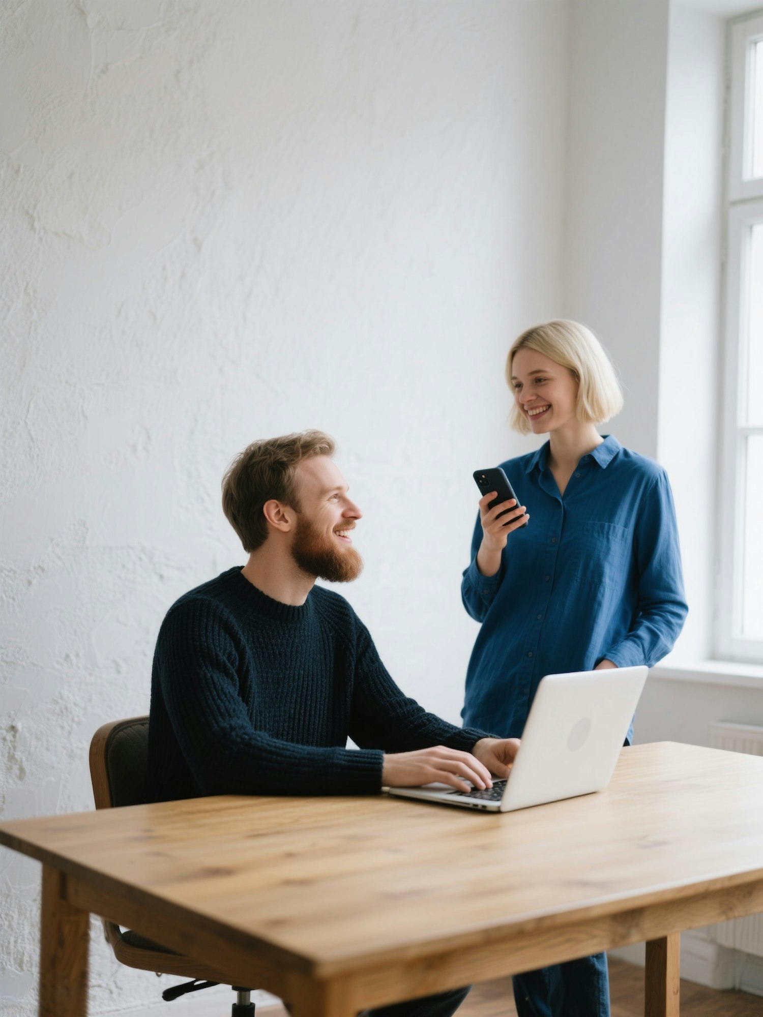 A minimal professional studio scene, soft daylight from a window, white textured wall, wooden desk, candid atmosphere, documentary photography style, high-definition image, a white man with a beard wearing a dark sweater seated in front of a laptop, smiling at a white woman with short blonde hair wearing a blue shirt, standing beside him with a phone in hand