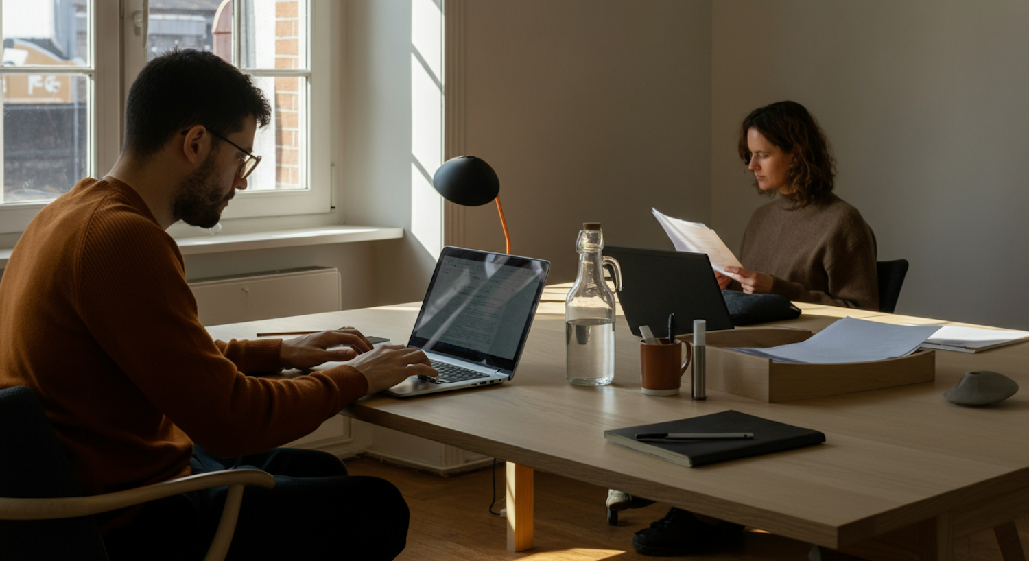 Two people working in a sunlit office, focusing on laptops and documents at a wooden desk.