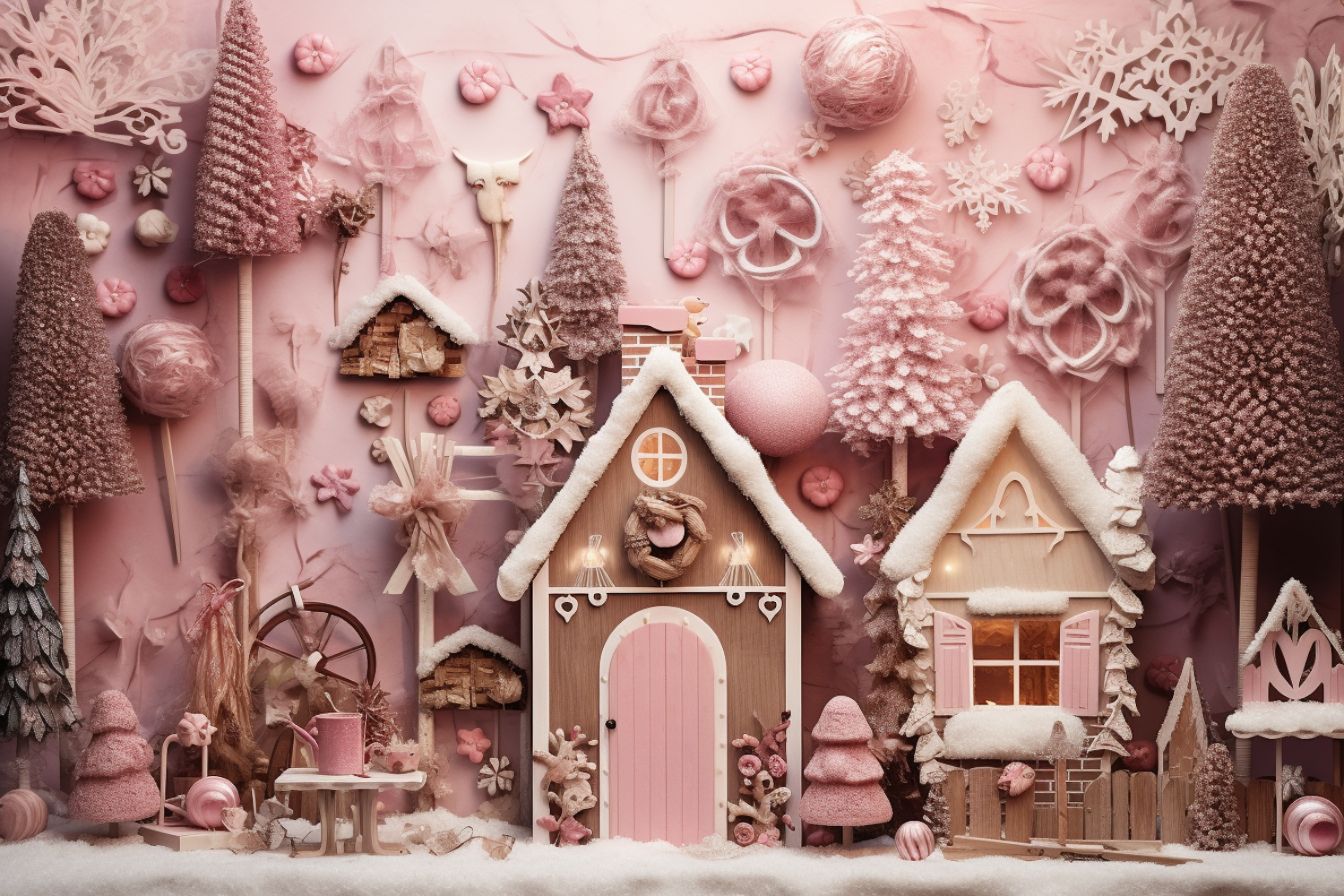 Whimsical pink winter village with snow-covered houses, frosted trees, and festive decorations in a dreamy pastel palette.