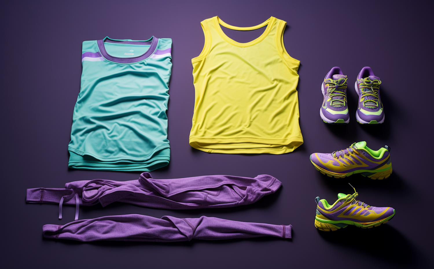 Vibrant athletic gear with teal and yellow tops, purple leggings, and colorful running shoes on a dark purple background.