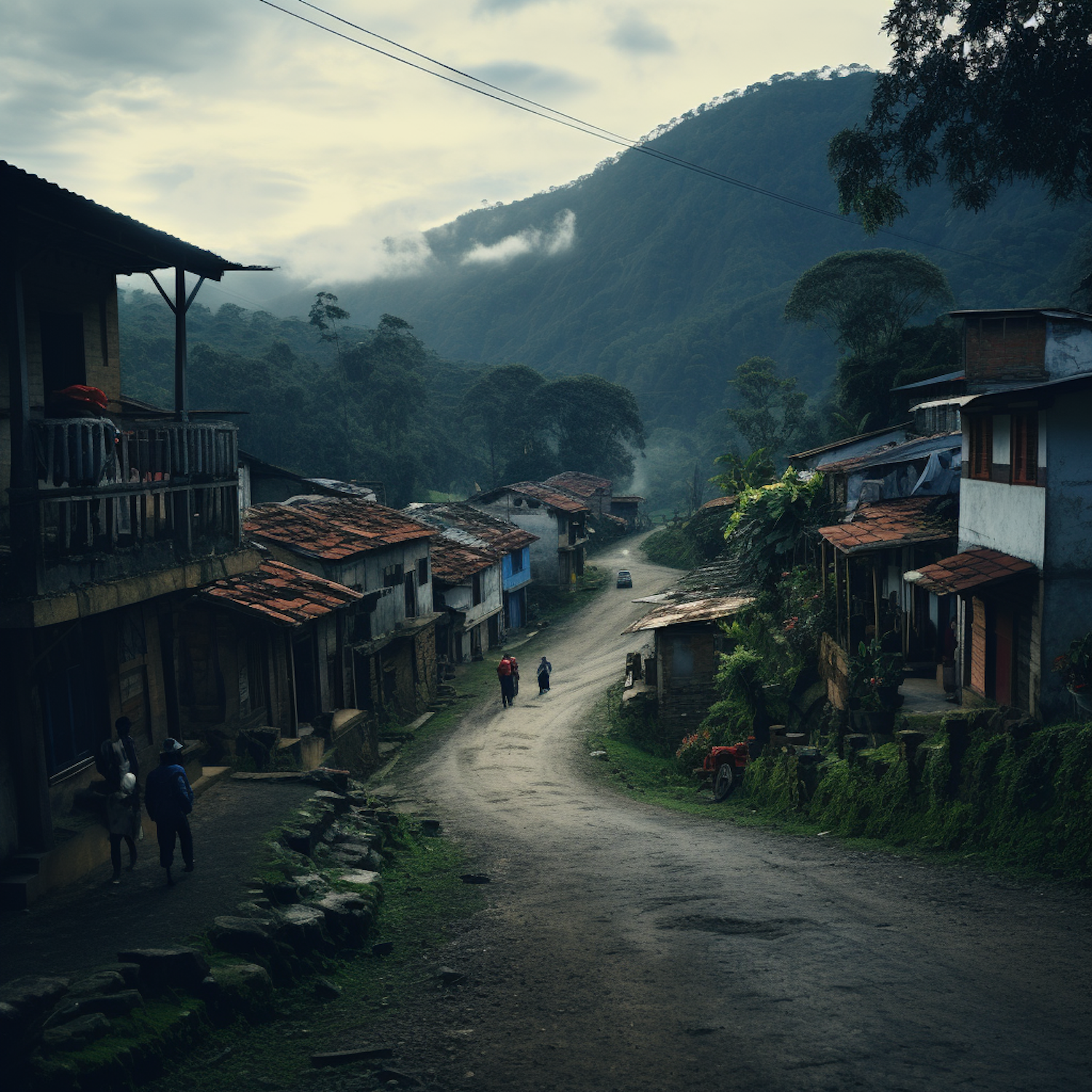 Rustic village with red-tiled houses, a winding dirt road, and misty hills in the background, exuding serene rural charm.