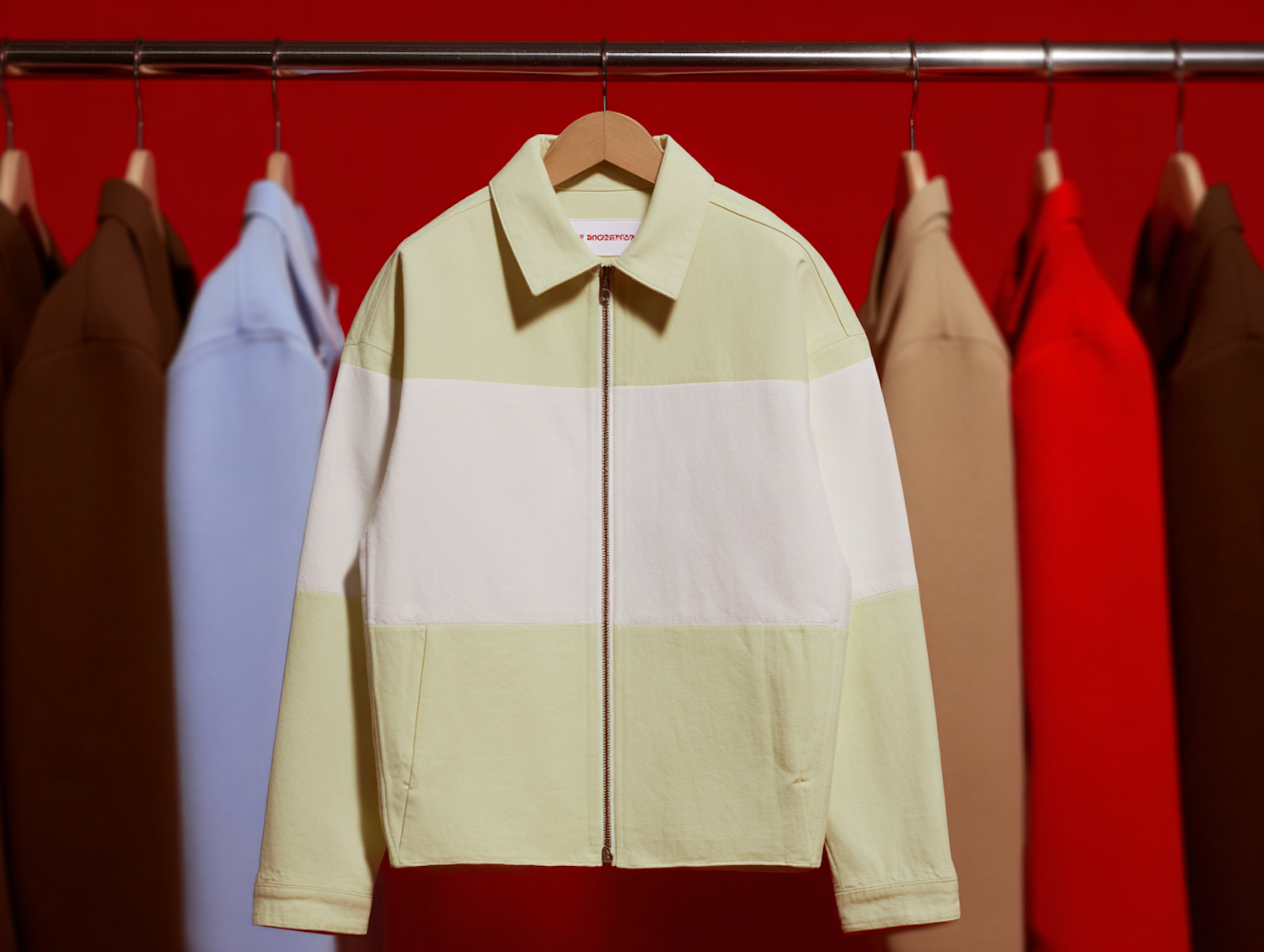 A pastel green and white jacket on a hanger, surrounded by colorful garments on a rack against a red background.
