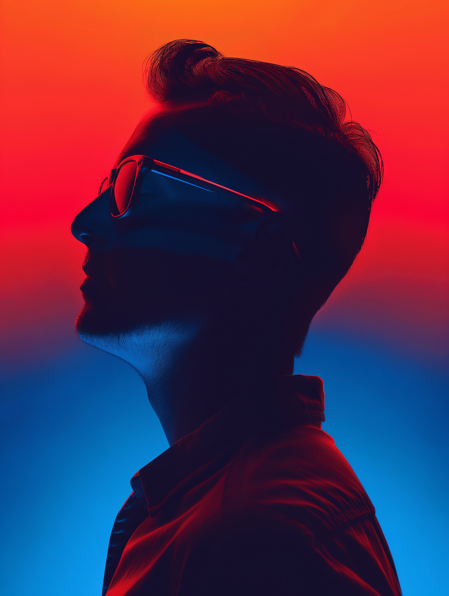 Silhouette of a man in sunglasses with a red to blue gradient background, creating a dramatic and modern artistic effect.