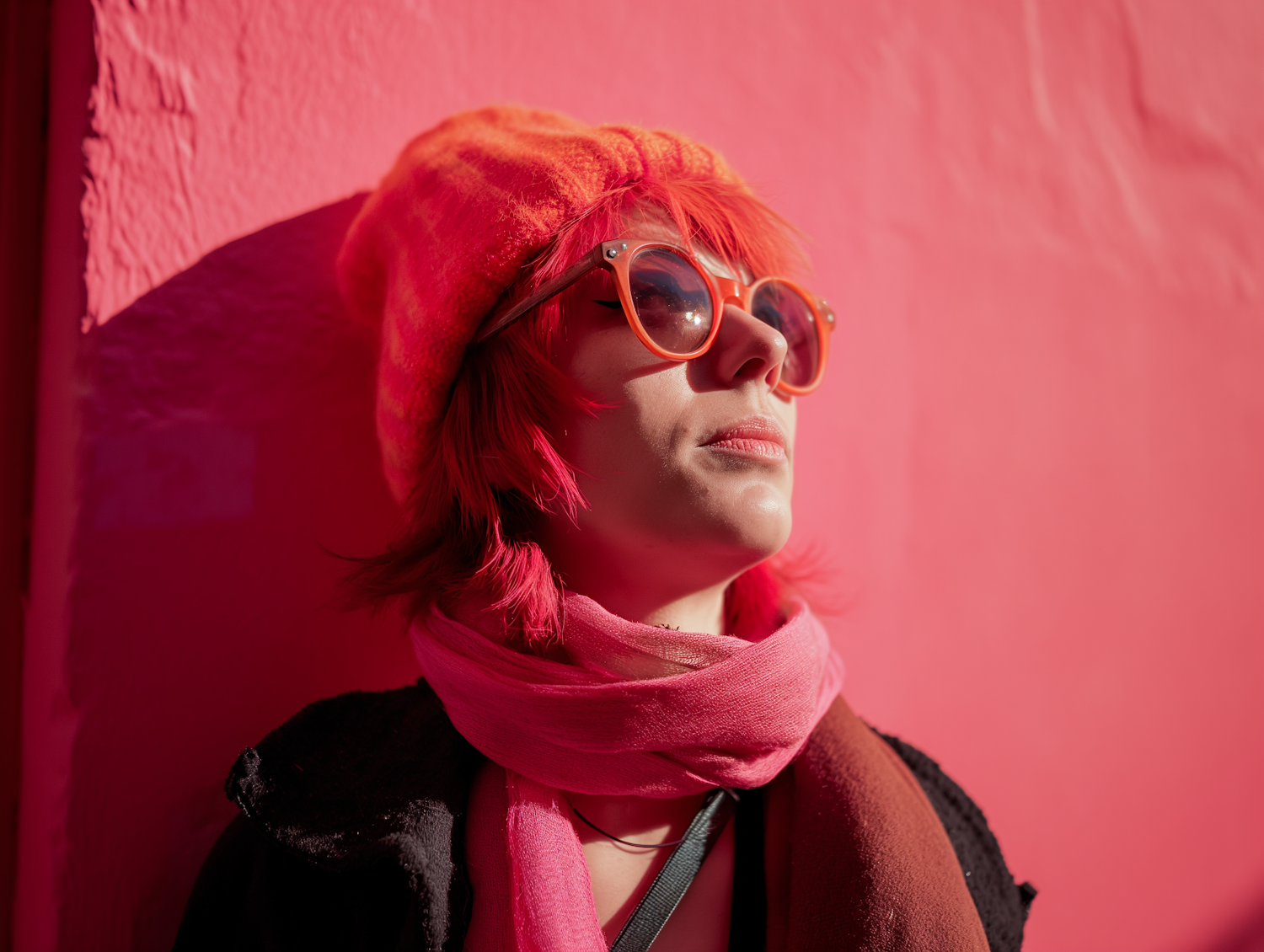 Person with red hair and orange sunglasses against a pink wall, wearing a bright beanie and scarf, basking in sunlight.