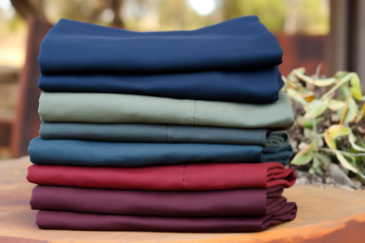 Stack of colorful folded fabrics in blue, green, teal, red, and burgundy on a wooden surface with a blurred natural background.