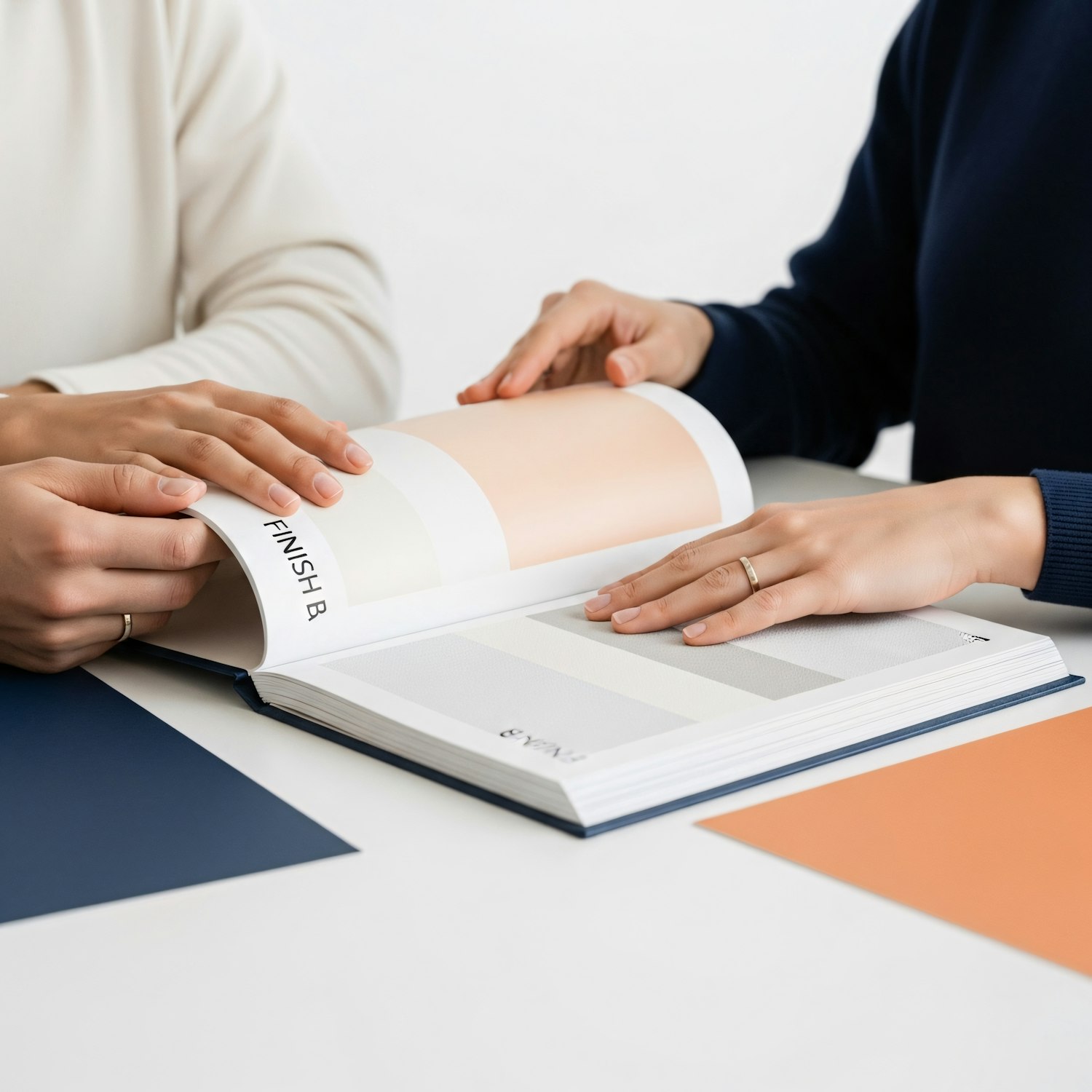 Two people reviewing a color swatch book with various shades and finishes, seated at a table with additional colored sheets.