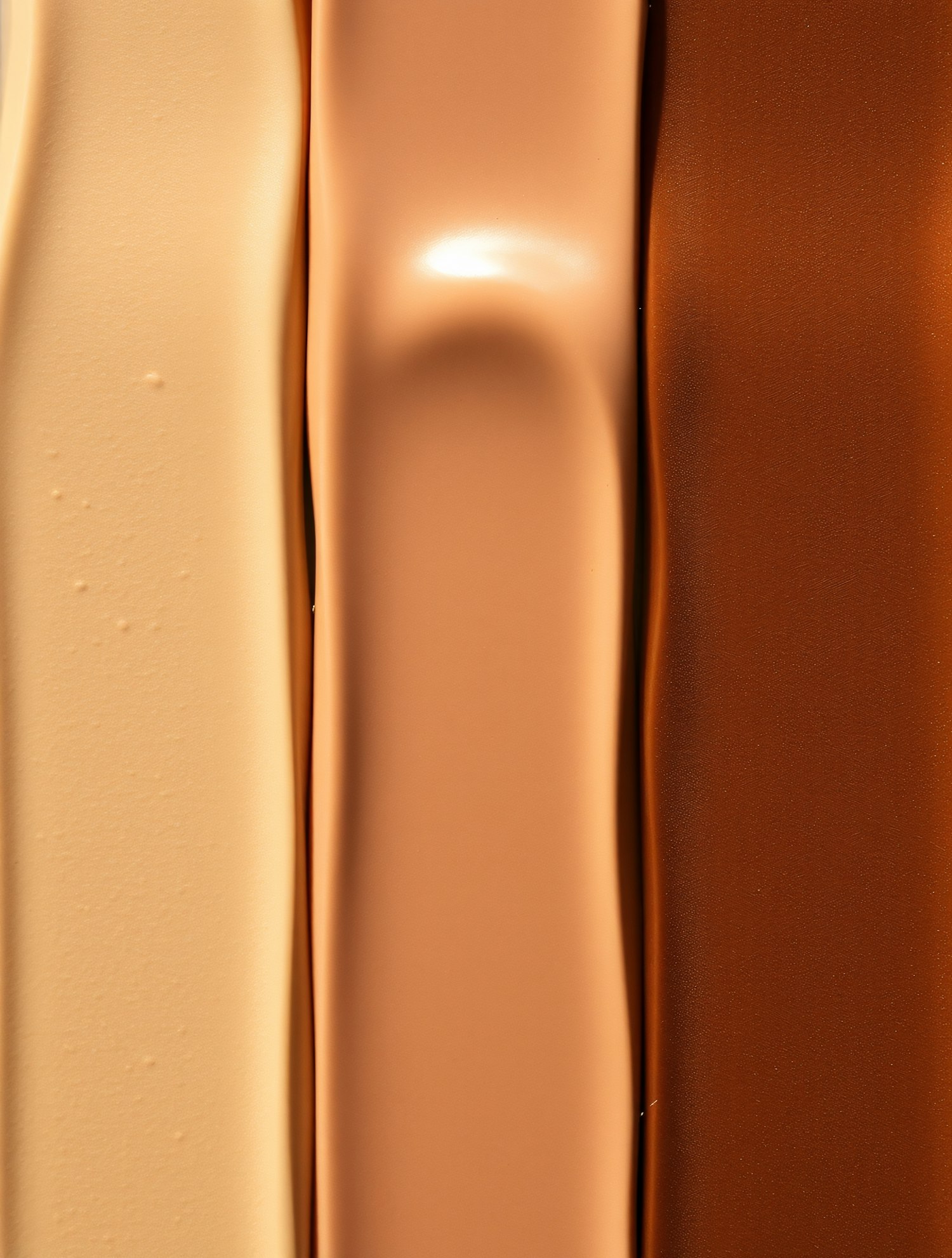 Three vertical swatches of liquid foundation in light beige, medium tan, and deep brown, showcasing a range of skin tones.