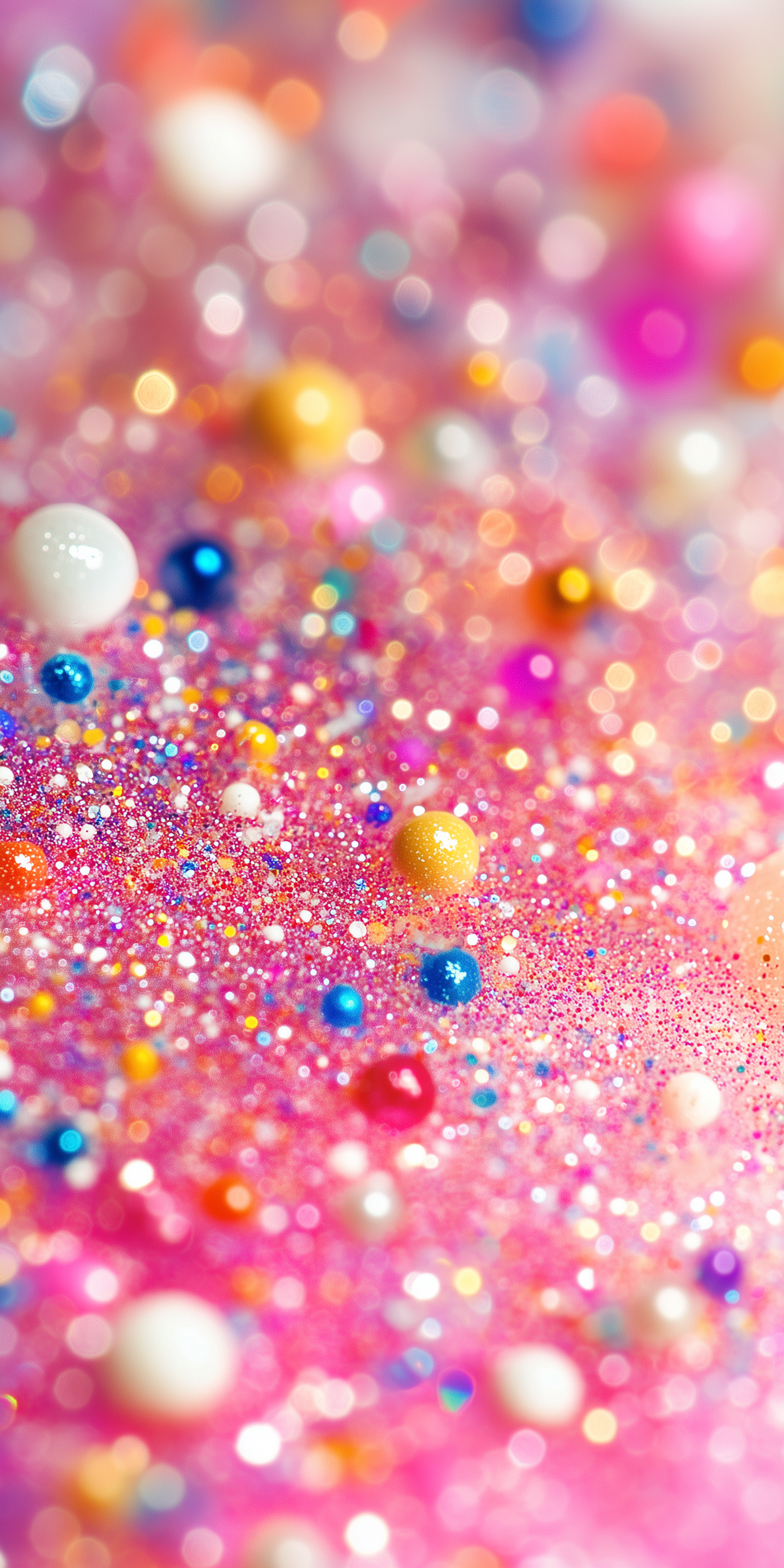 A dreamy mix of glitter, sparkles, and colorful beads on a pink background, creating a vibrant and festive abstract composition.