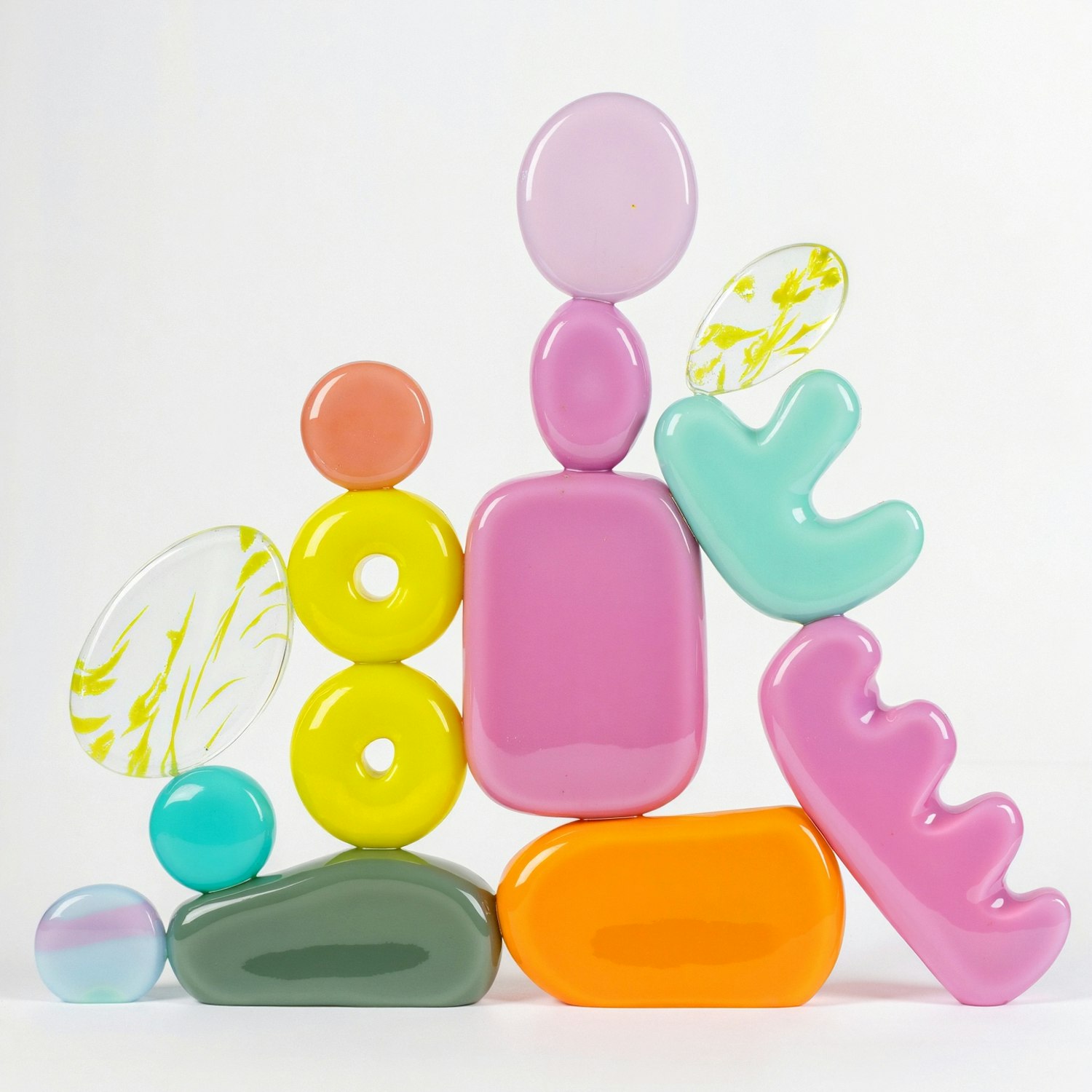 Colorful abstract sculpture with smooth, rounded shapes in pink, yellow, orange, and blue, creating a playful and balanced composition.