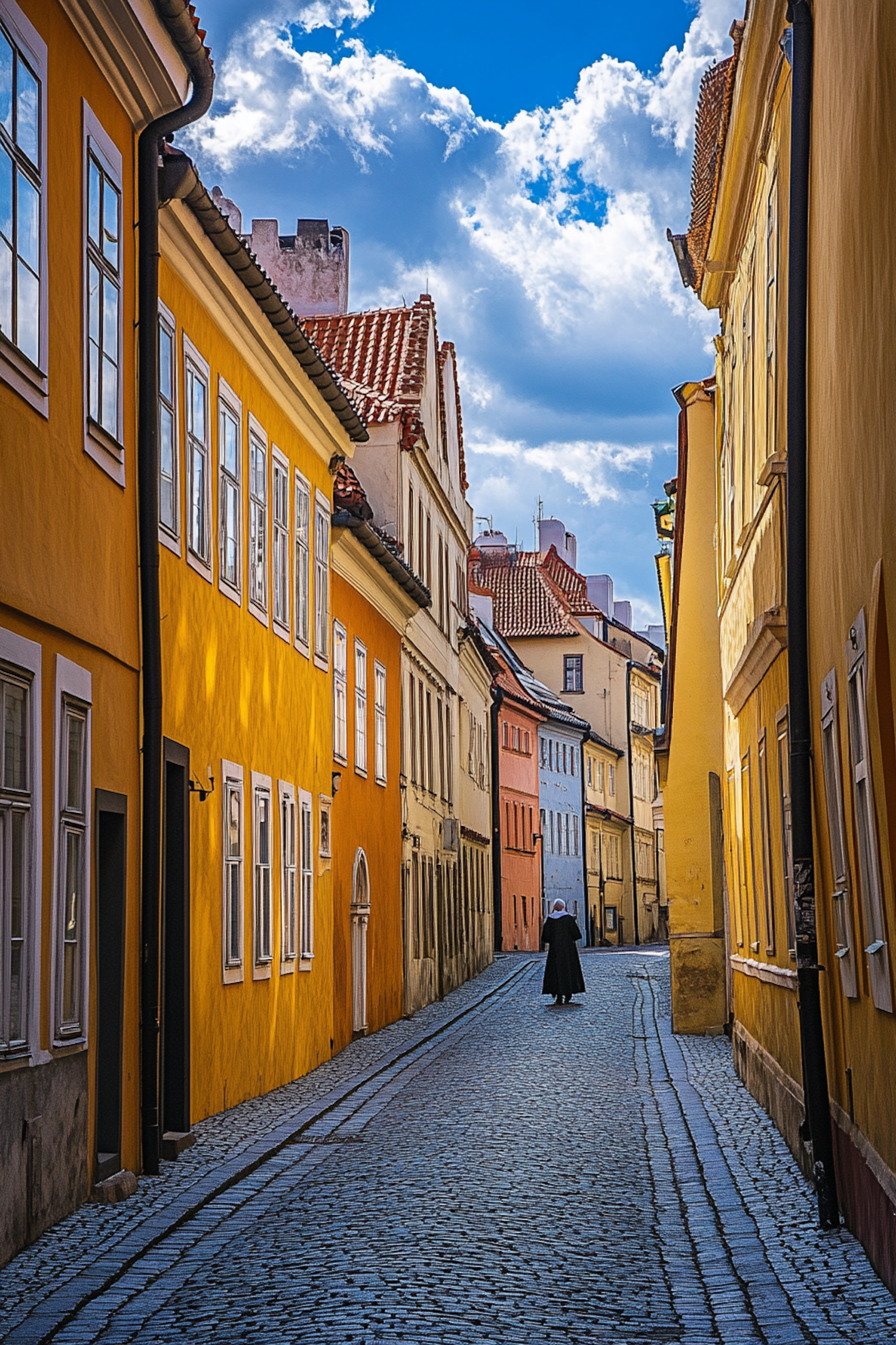 Charming European street with colorful buildings, cobblestones, and a lone figure under a bright blue sky with fluffy clouds.