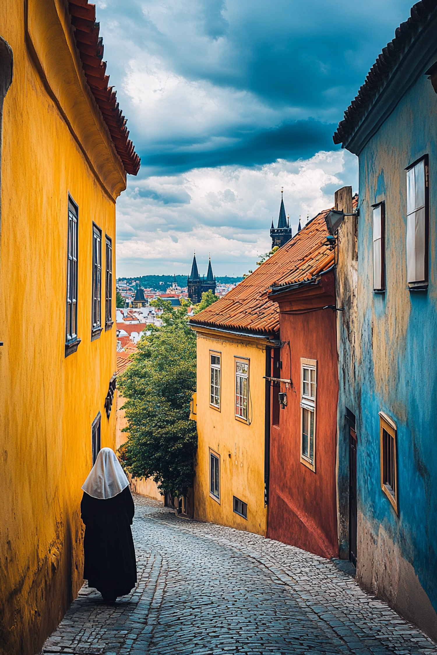 Charming cobblestone street with colorful buildings, a lone figure, and Gothic spires under a dramatic cloudy sky.