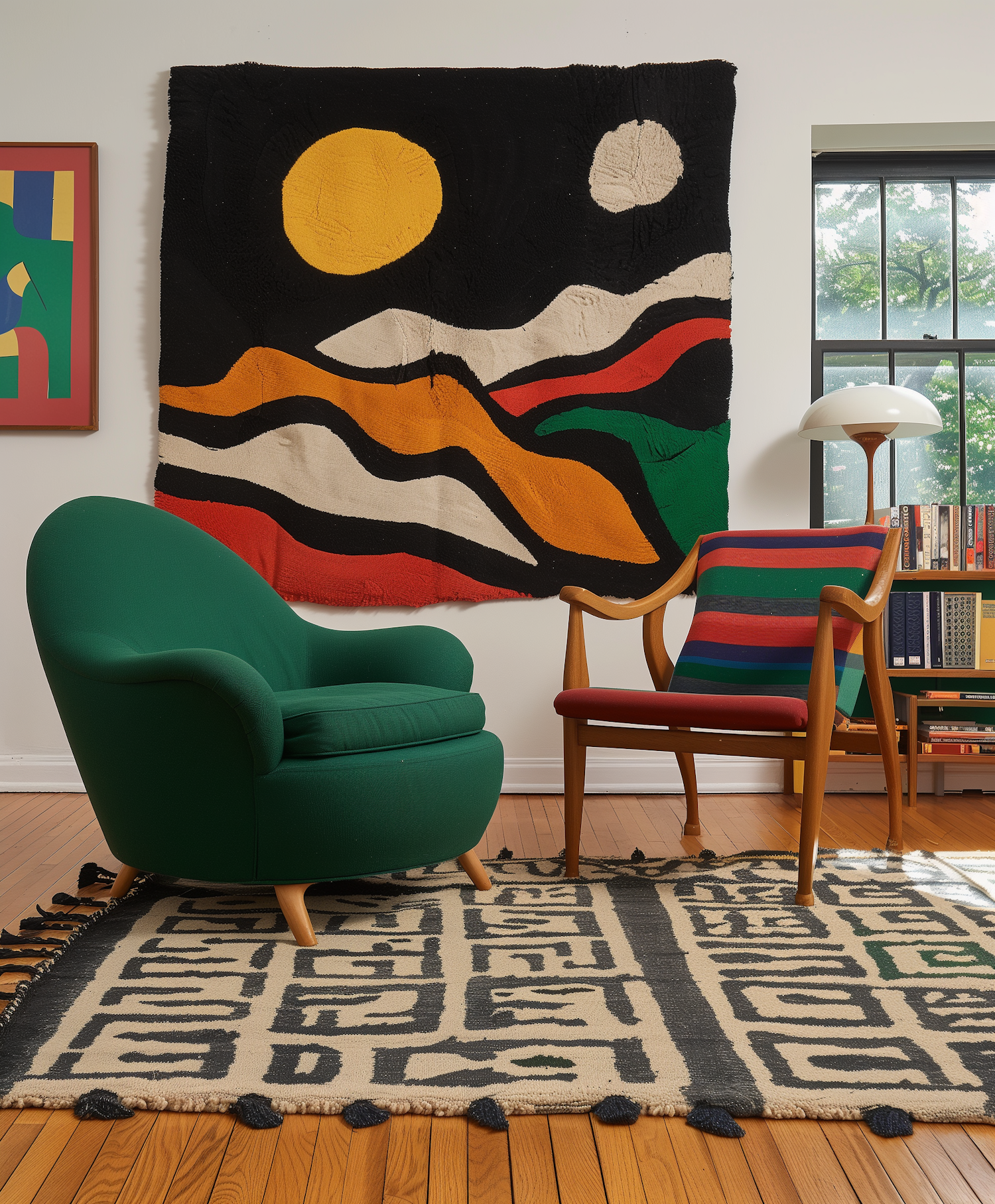 Eclectic living room with vibrant tapestry, green armchair, colorful chair, and geometric rug. Modern and artistic decor.
