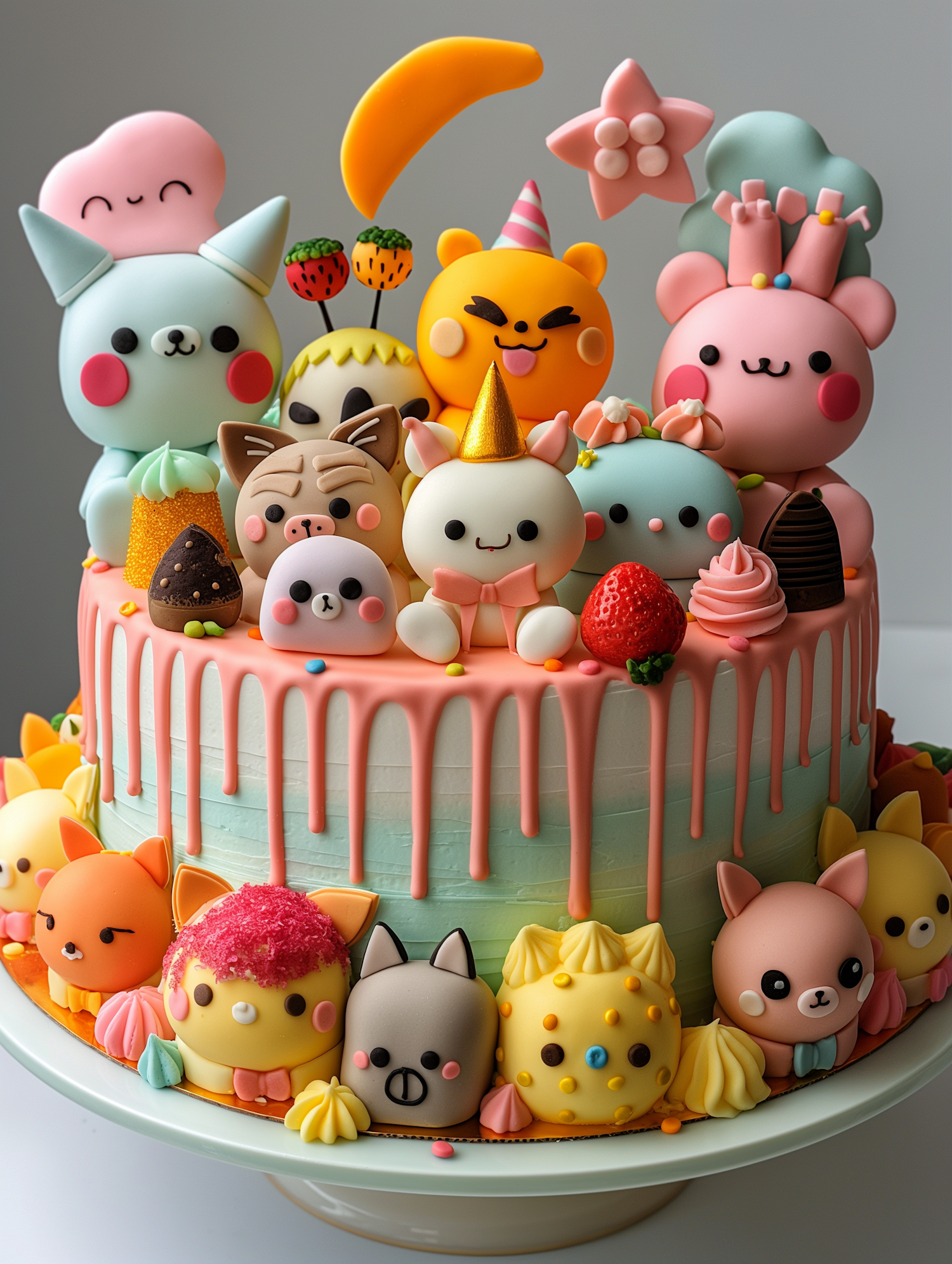 Whimsical cake with colorful fondant cartoon characters, featuring a pastel gradient and pink drip icing. Perfect for a fun celebration!
