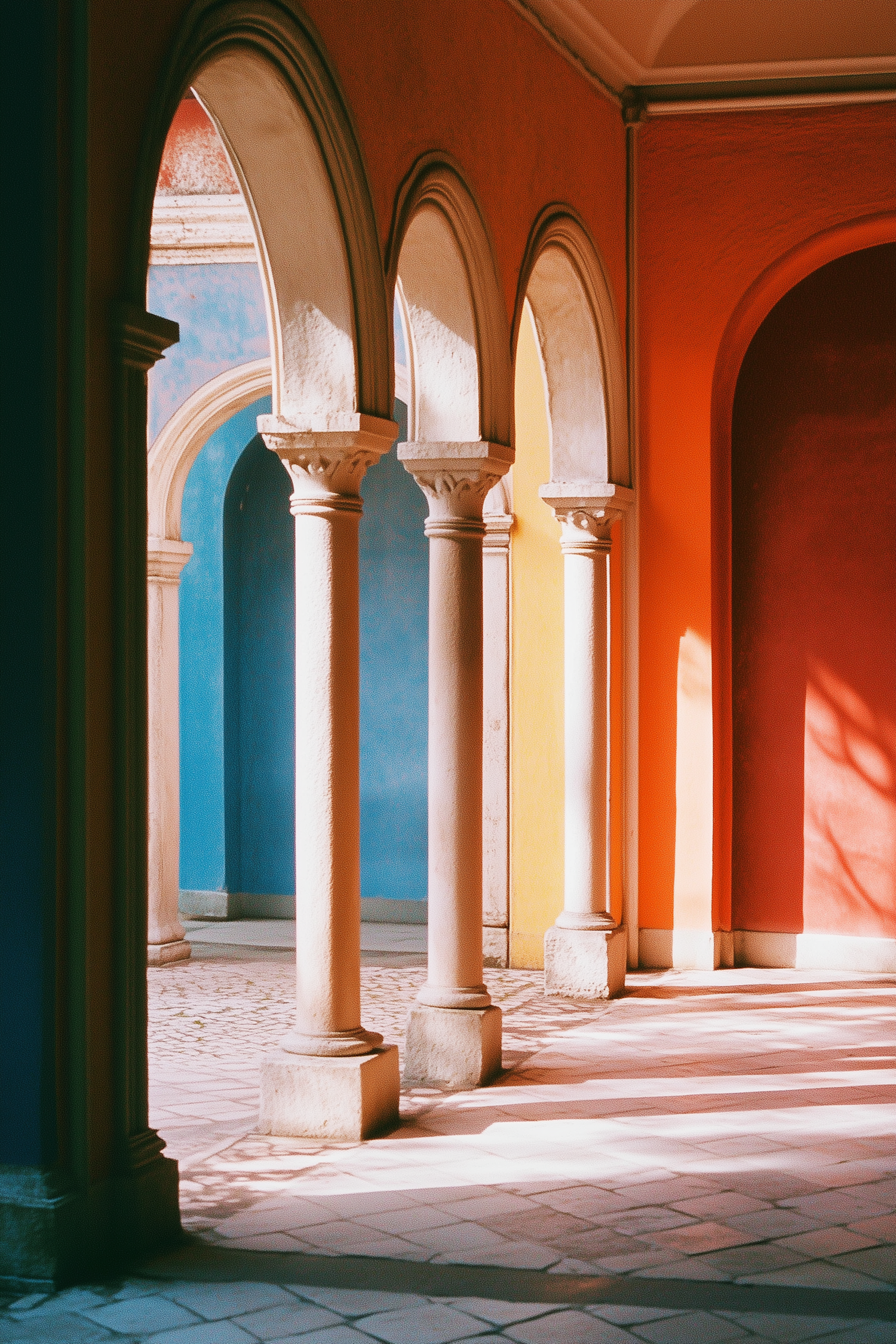 Vibrant arches and columns in blue, yellow, and red, with sunlight casting shadows on a tiled floor, creating a warm atmosphere.