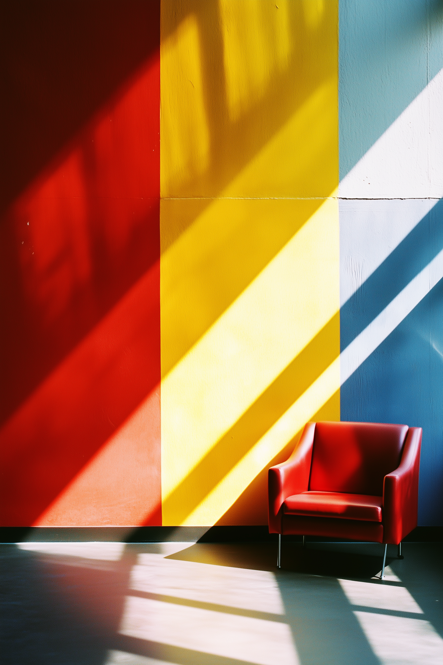 Modern red armchair against a colorful wall with bold red, yellow, and blue sections, enhanced by dramatic sunlight and shadows.