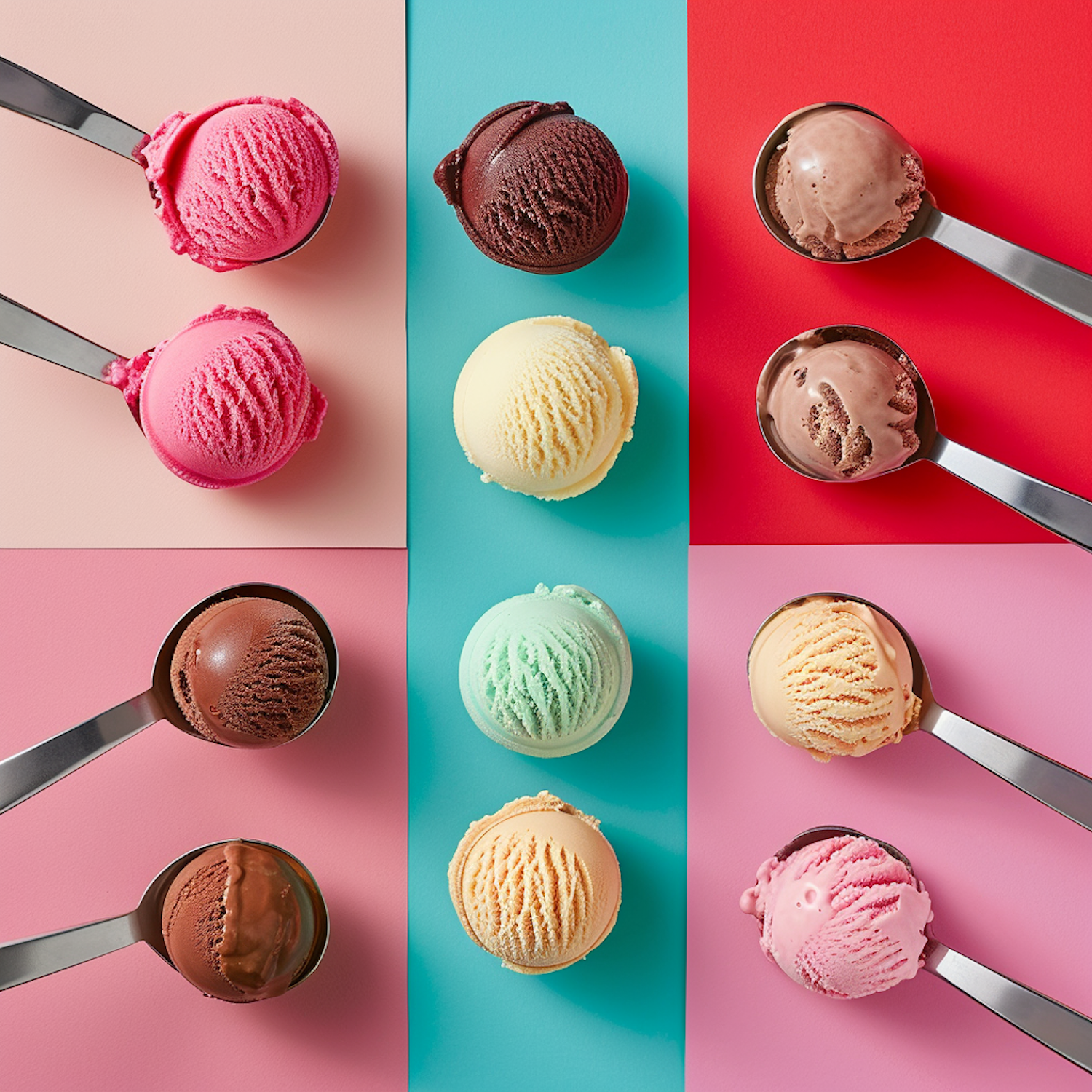 Colorful ice cream scoops on a vibrant background, featuring pink, chocolate, yellow, mint, and peach flavors in a symmetrical layout.