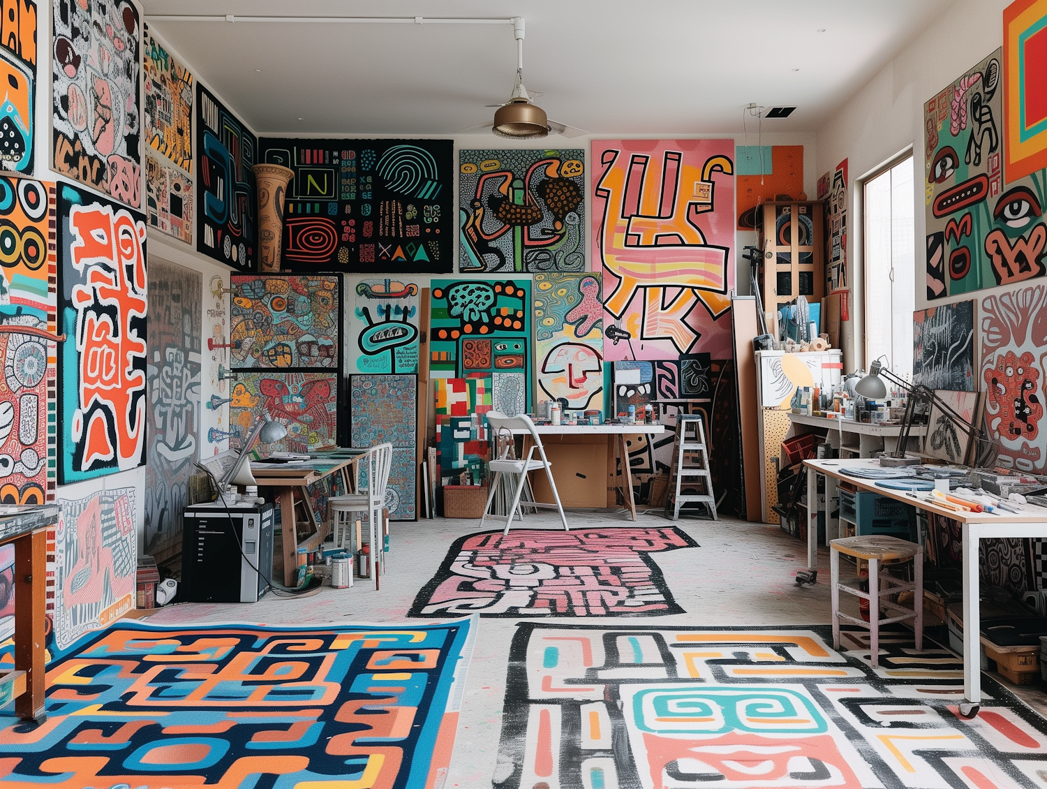 Colorful art studio with abstract paintings, bold geometric patterns, and vibrant decor. Creative workspace with art supplies and natural light.