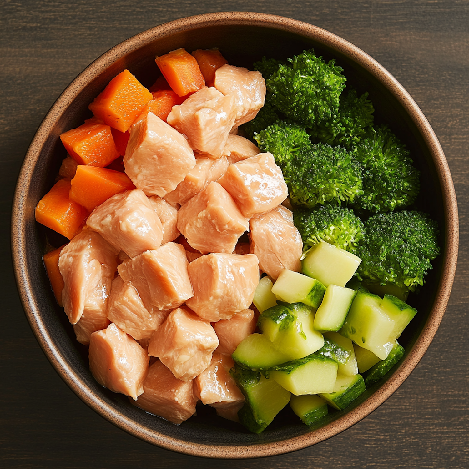 A healthy bowl with chicken, carrots, broccoli, and zucchini, showcasing a colorful and nutritious meal.