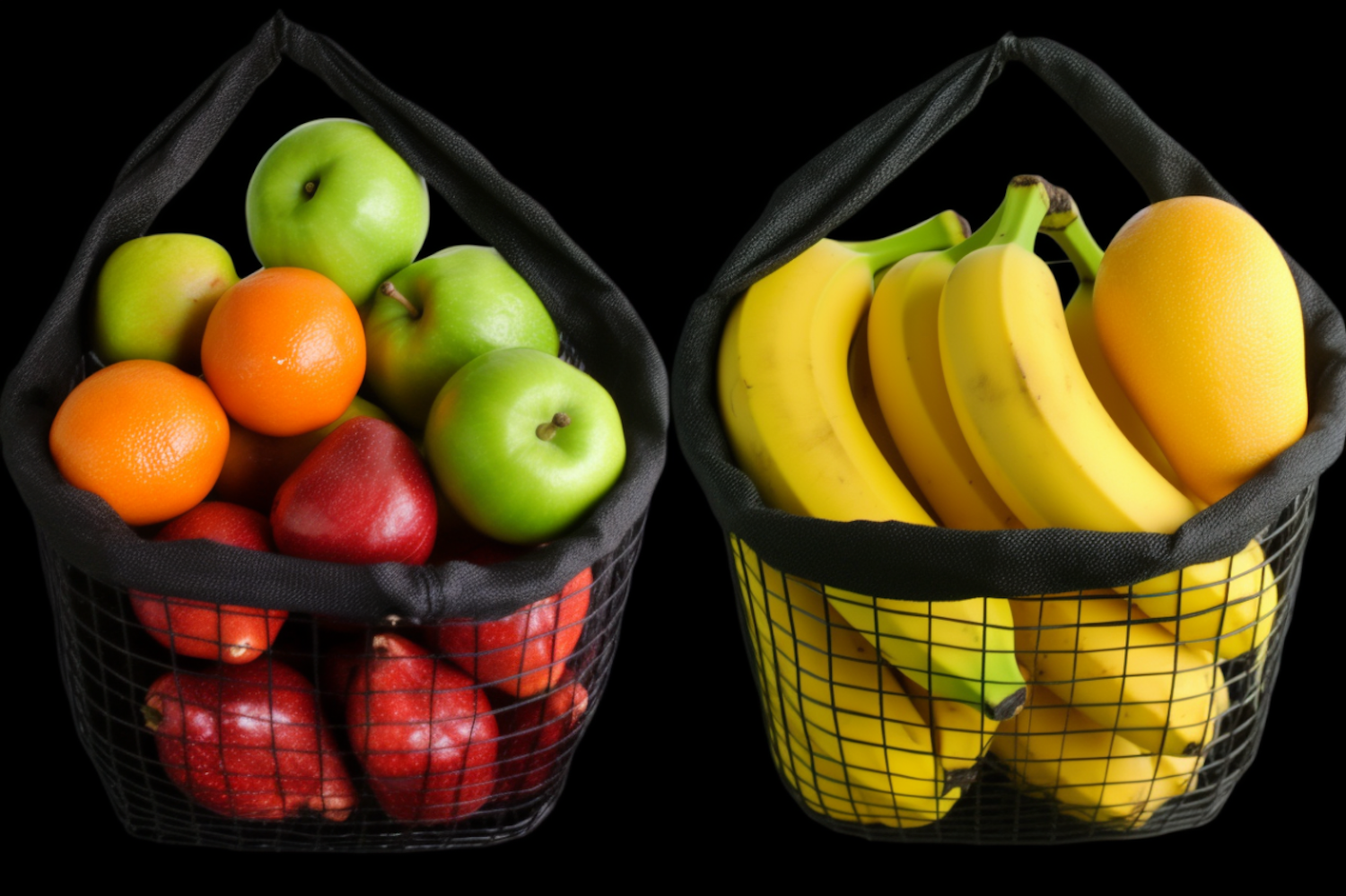 Two baskets filled with colorful fruits: green apples, oranges, red pears, bananas, and a mango, set against a black background.