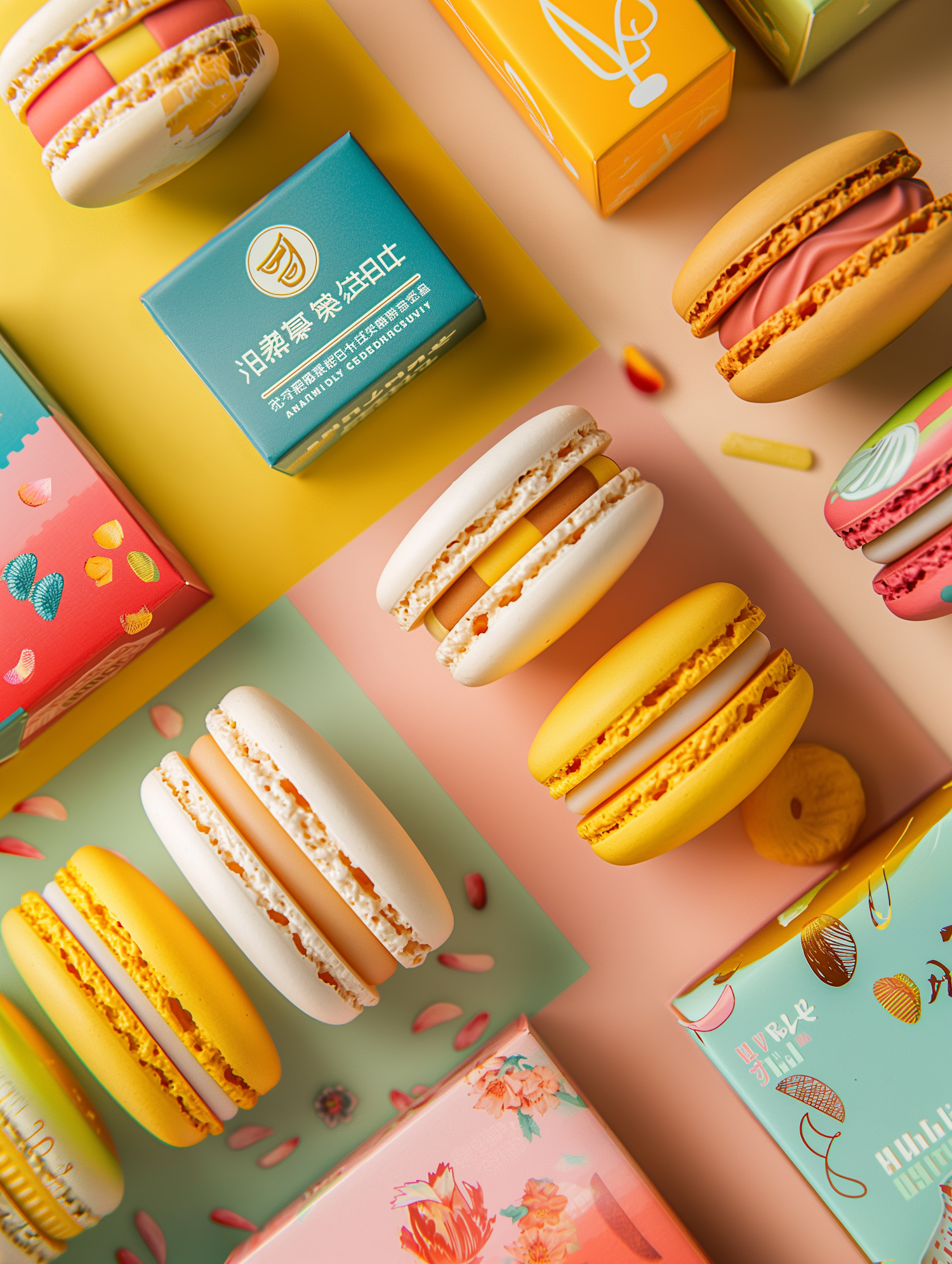 Colorful macarons with artistic packaging on a pastel background, showcasing vibrant designs and creamy fillings.