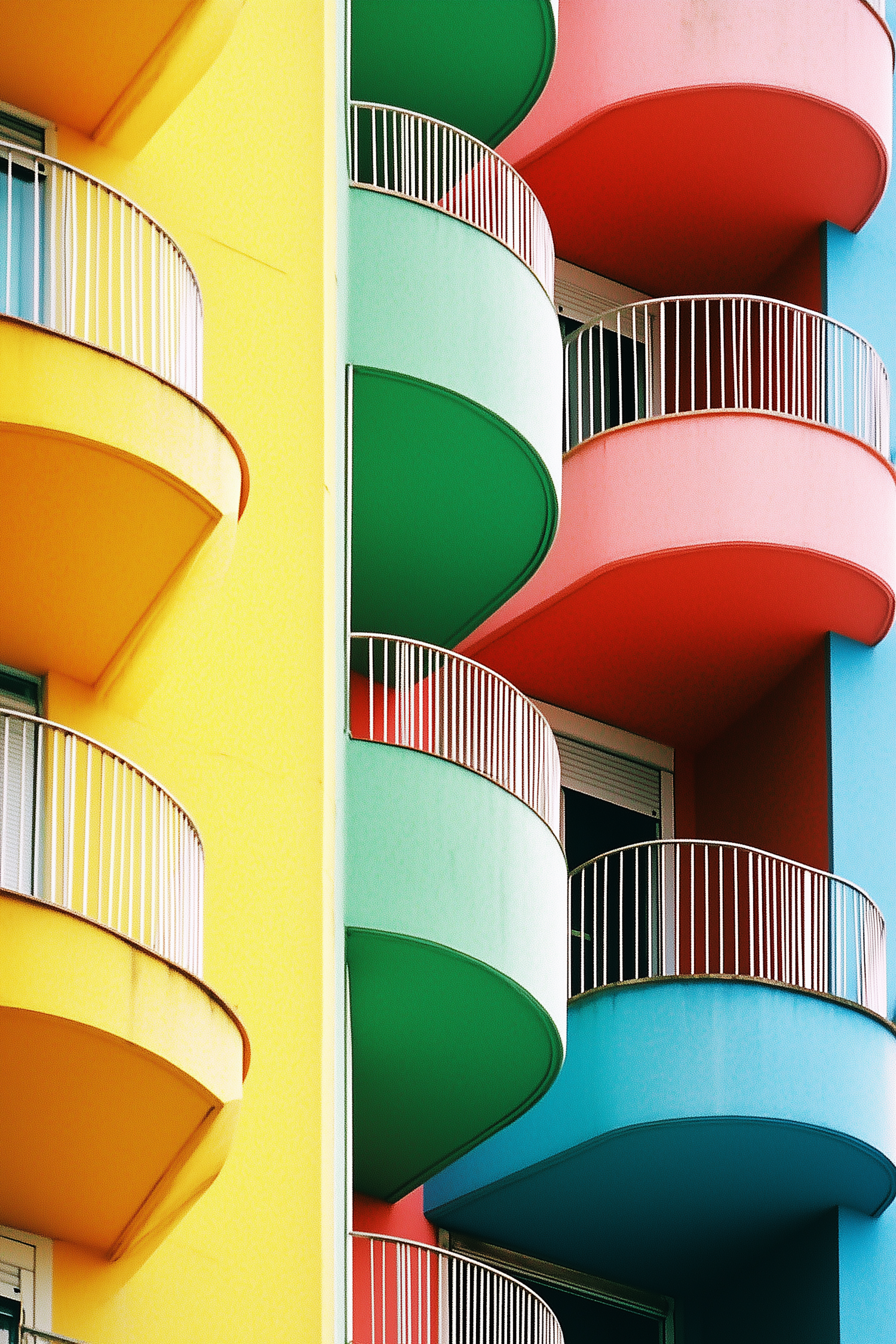Colorful curved balconies in vibrant hues create a striking architectural pattern, showcasing modern urban design and creativity.