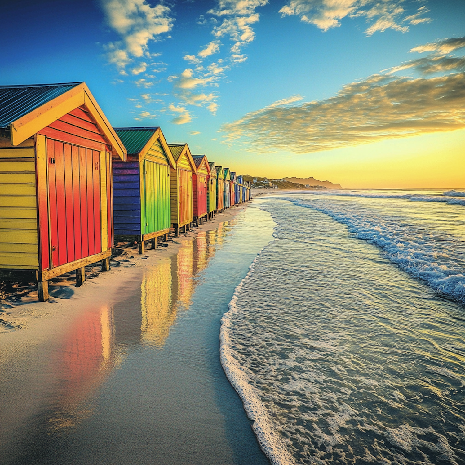 Vibrant beach huts line a serene shore at sunset, with colorful reflections on wet sand and gentle ocean waves under a golden sky.