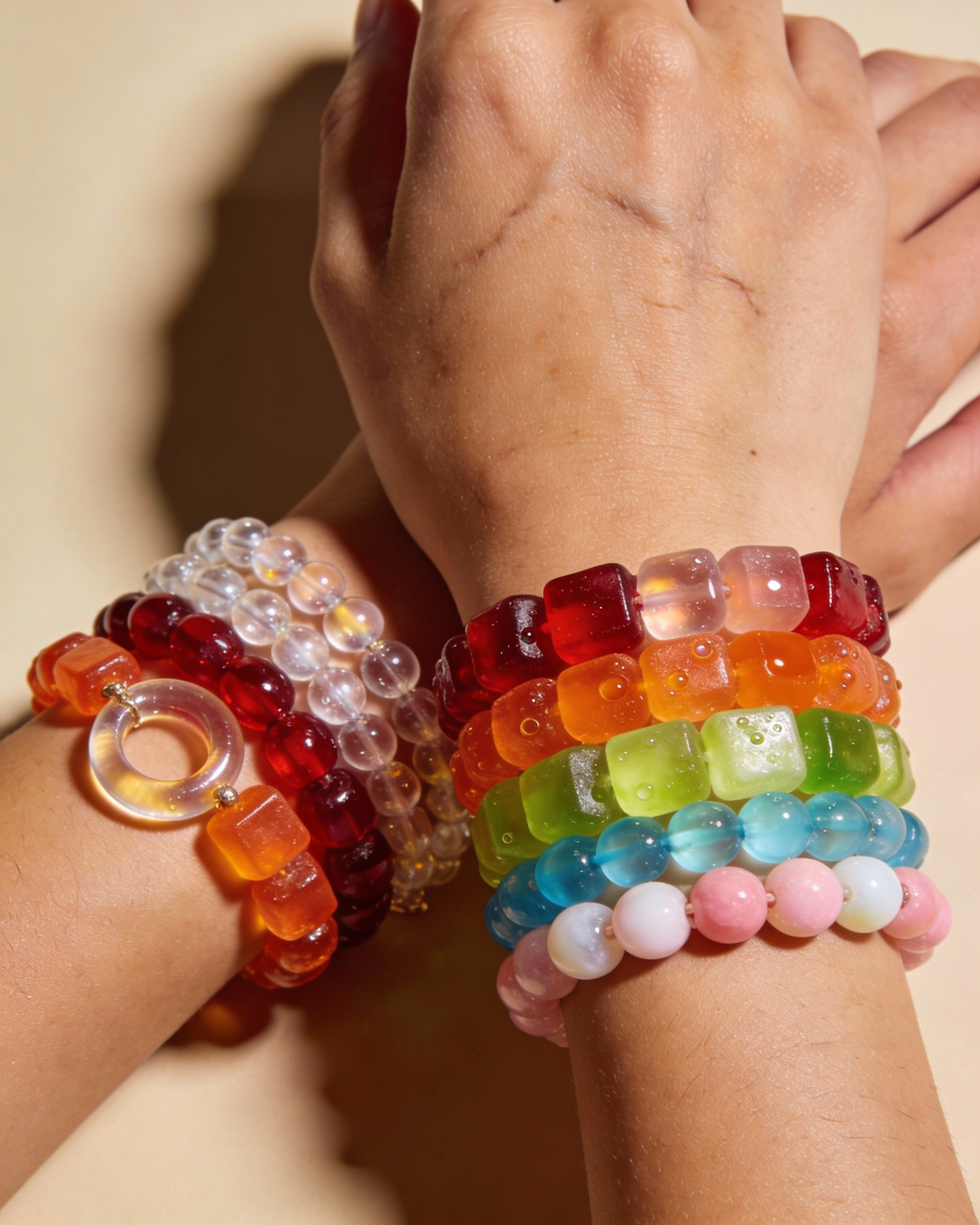High-end fashion accessories editorial shot focused on both wrists and hands, resting naturally on a clean surface. The subject wears multiple stacked bracelets made entirely from gummy candy: translucent gummy beads, jelly rings, soft cube gummies, and rounded candy links connected like fine jewelry. Gummies vary slightly in shape and thickness, showing realistic imperfections, tiny air bubbles, and soft gelatin texture. Colors include ruby red, citrus orange, lime green, aqua blue, and milky pastel pink. Bracelets appear glossy, slightly sticky, and gently compressed where they touch the skin. Skin tone is natural and realistic with visible veins and texture. Background is a minimal warm beige studio surface. Lighting is controlled studio jewelry lighting with soft key light and subtle rim highlights, emphasizing refraction and shine through the gummies. Ultra-sharp focus, luxury product photography aesthetic, candy rendered as couture accessories.