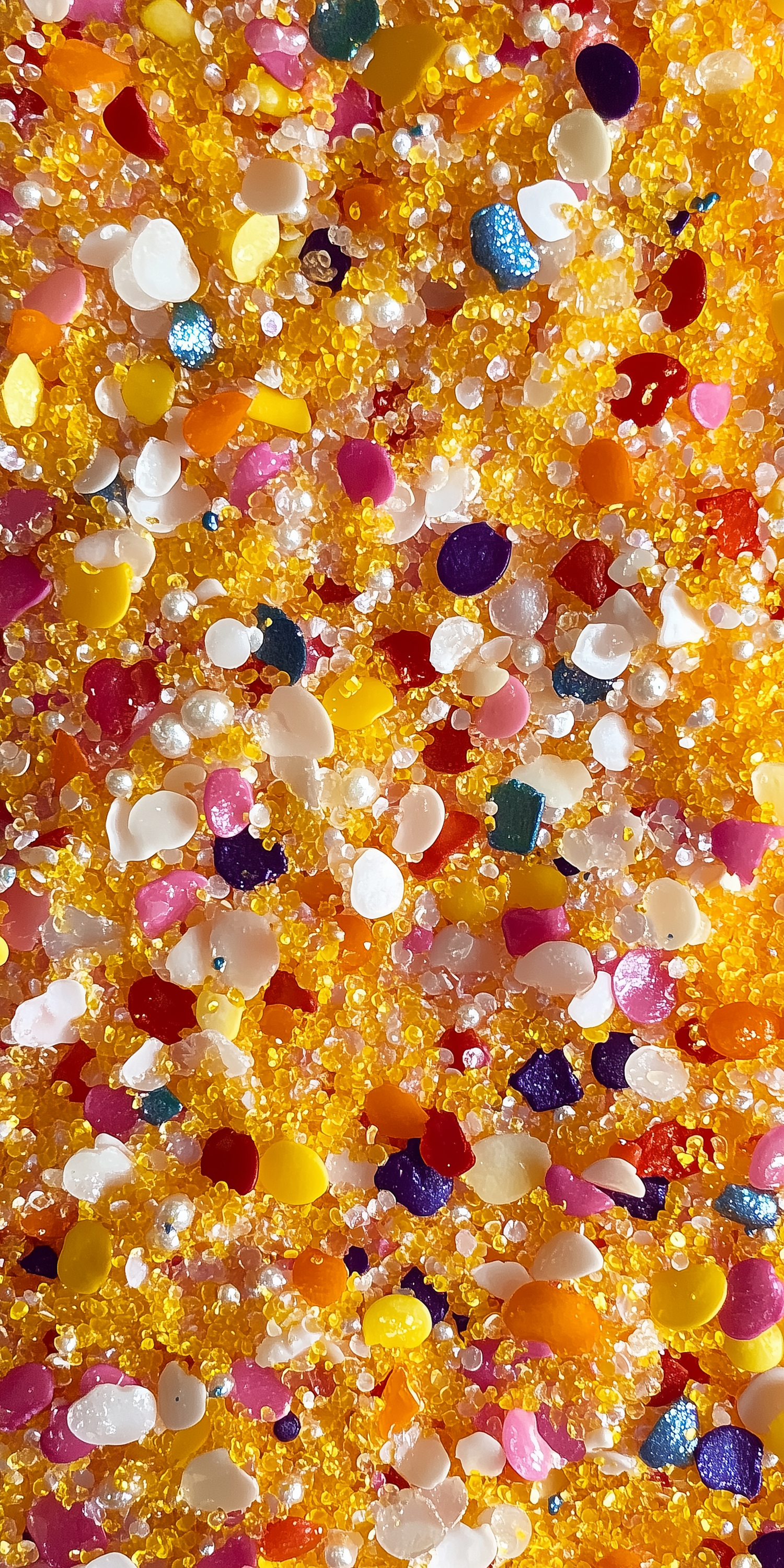 Bright and colorful close-up of yellow beads and multicolored confetti pieces, creating a playful and festive texture.
