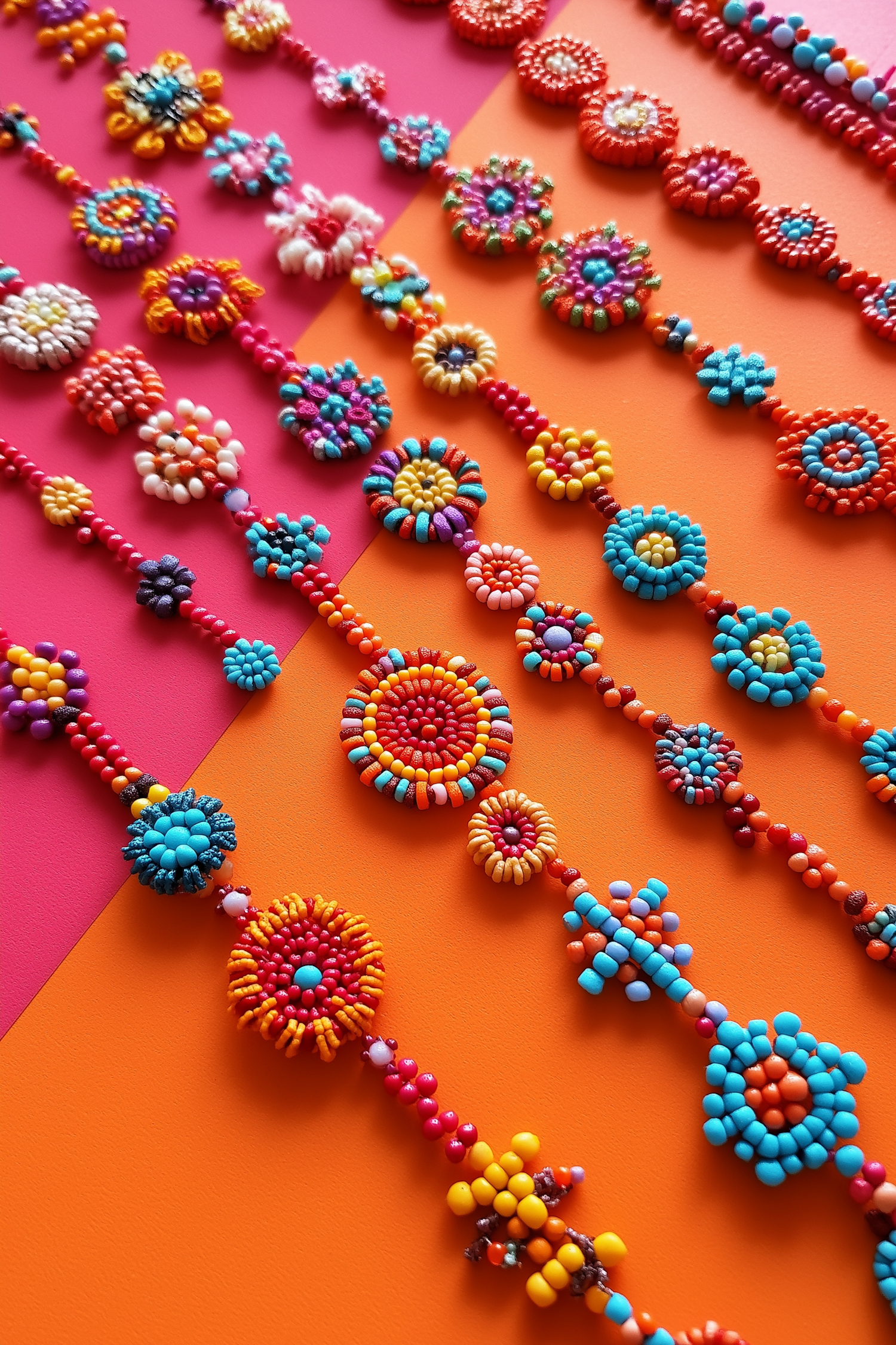 Colorful handmade beaded jewelry on a vibrant pink and orange background, showcasing intricate designs and patterns.
