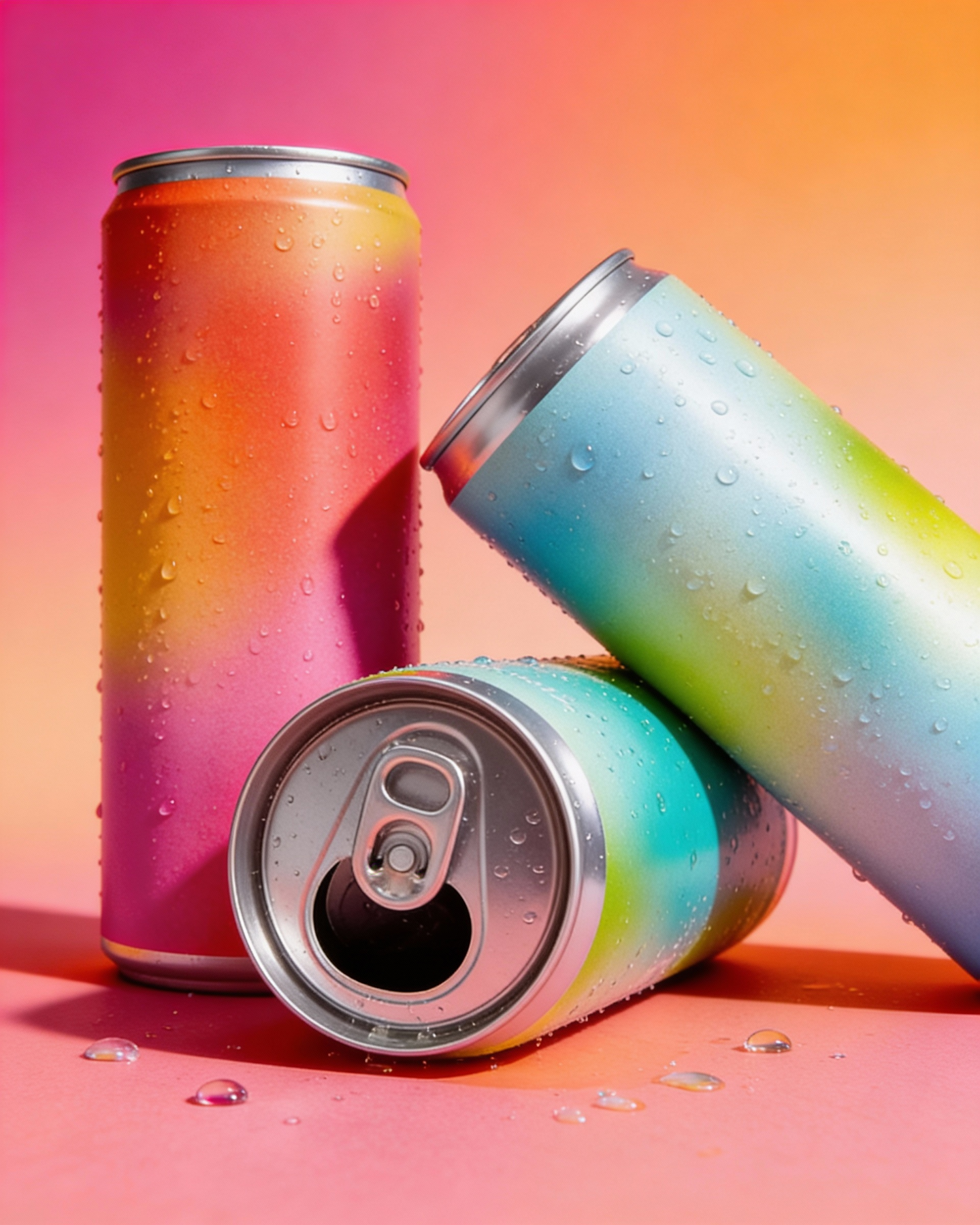 Vibrant gradient beverage cans with condensation on a colorful background, evoking a refreshing and modern aesthetic.
