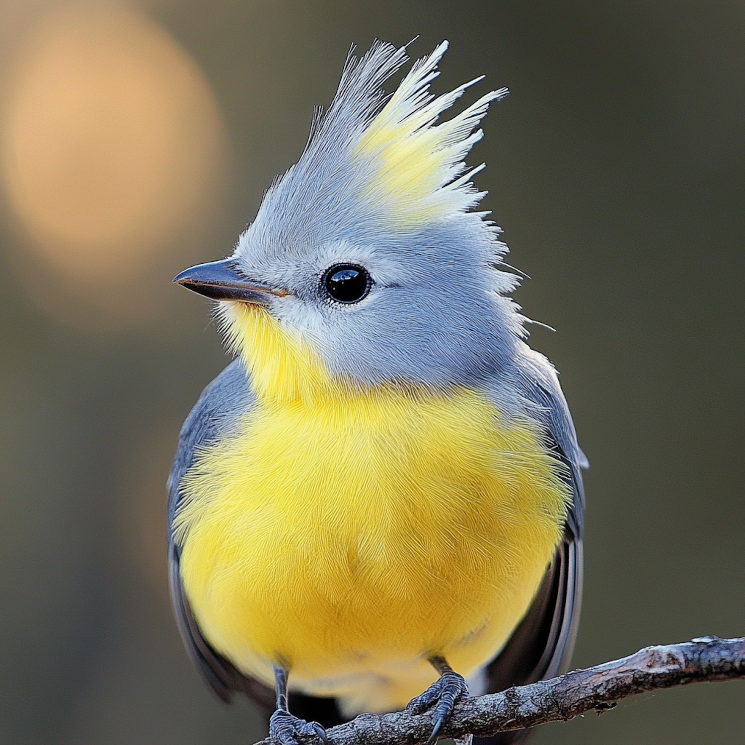 Vibrant bird with gray and yellow plumage and a striking crest perched on a branch, set against a soft, blurred background.