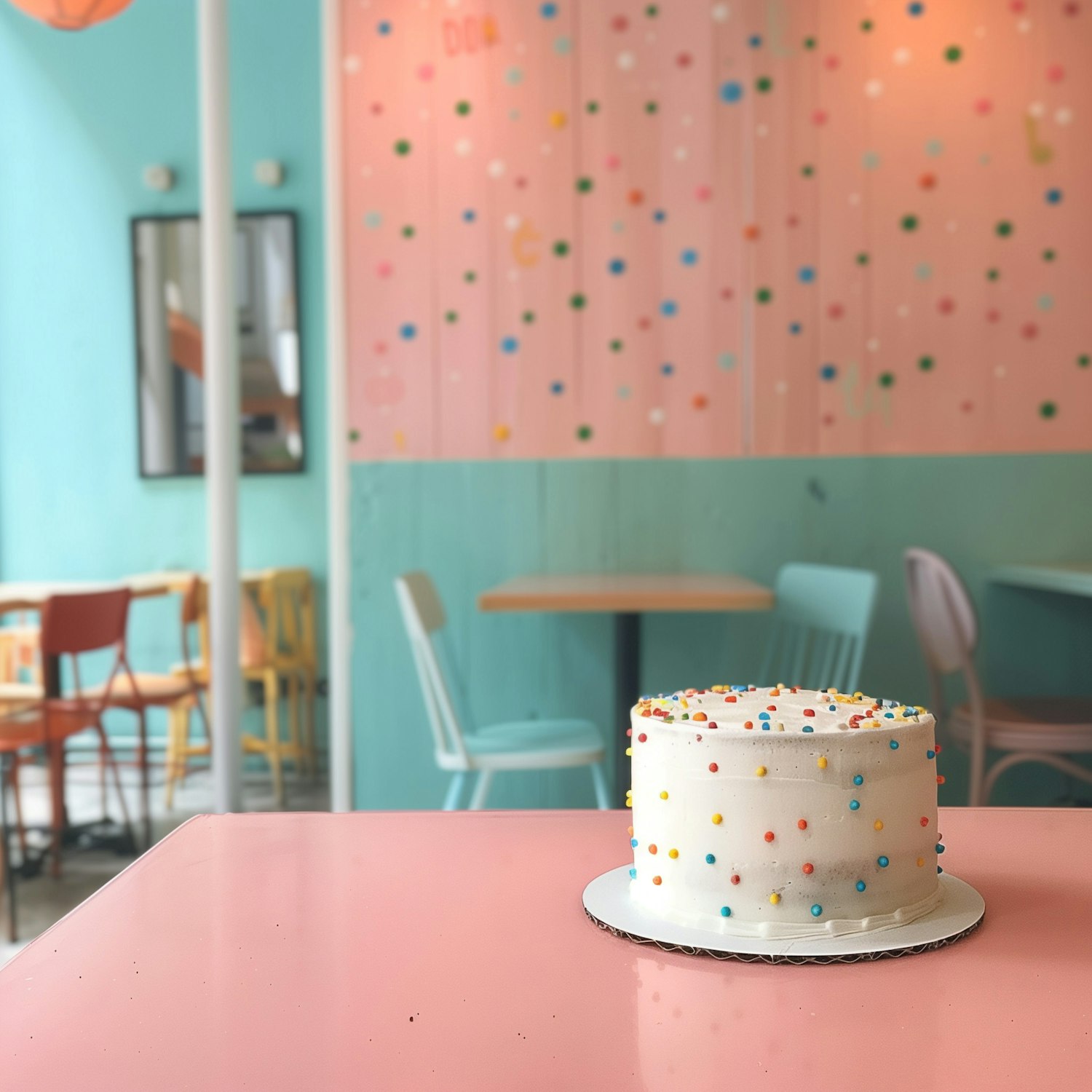 Colorful polka dot cake on a pink table in a pastel-themed cafe with playful decor and vibrant ambiance.