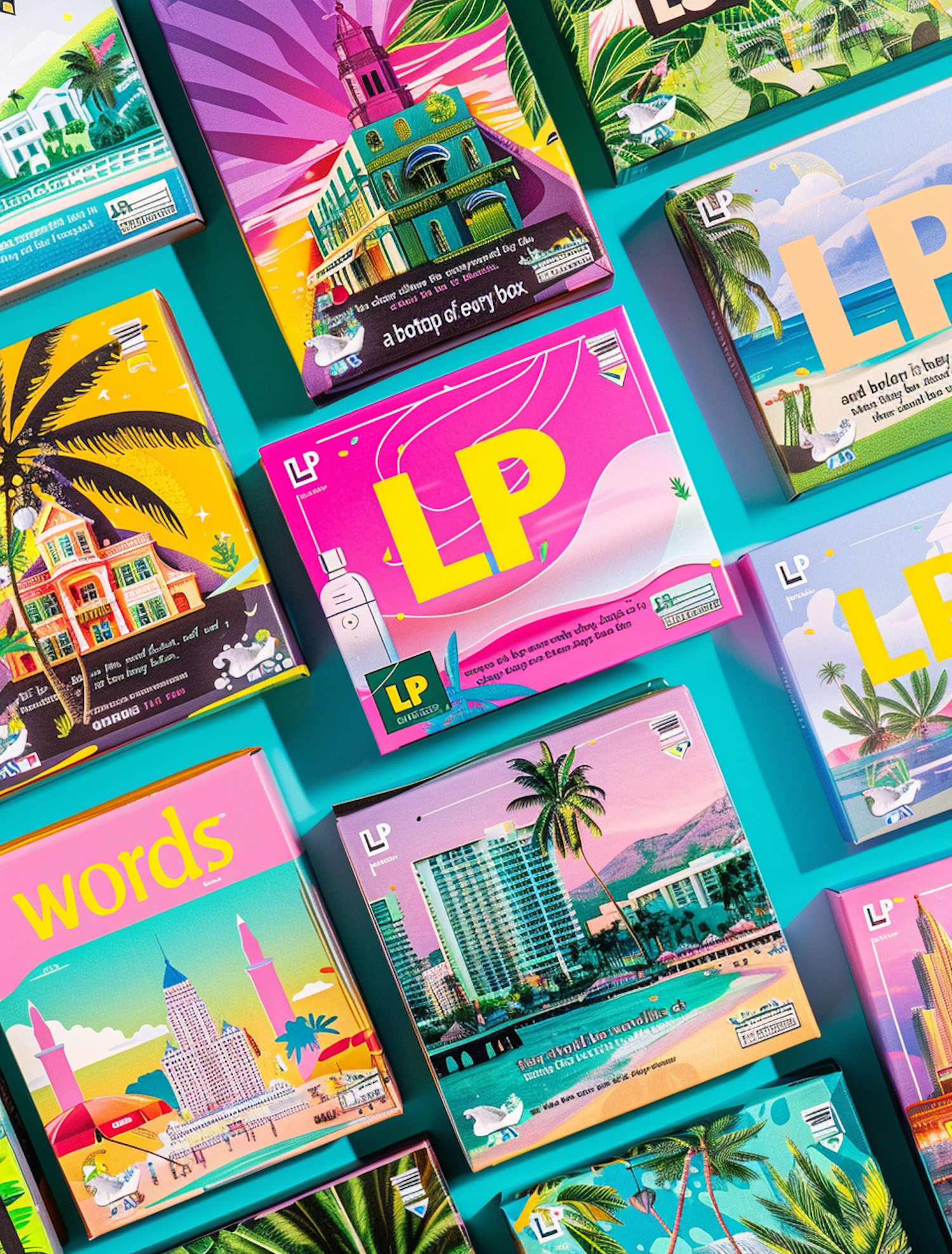 Colorful travel-themed packaging with tropical and urban illustrations on a turquoise background, featuring bold typography and vibrant designs.