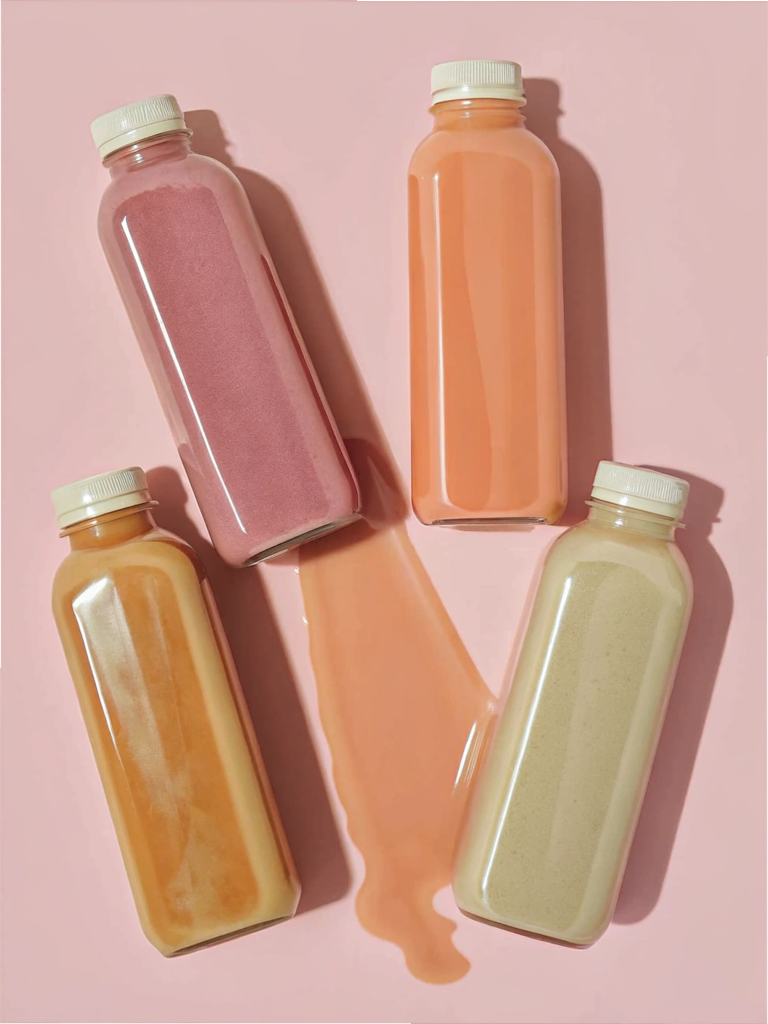 Four colorful juice bottles on a pink background, one tipped over spilling orange liquid. Bright and minimal aesthetic.