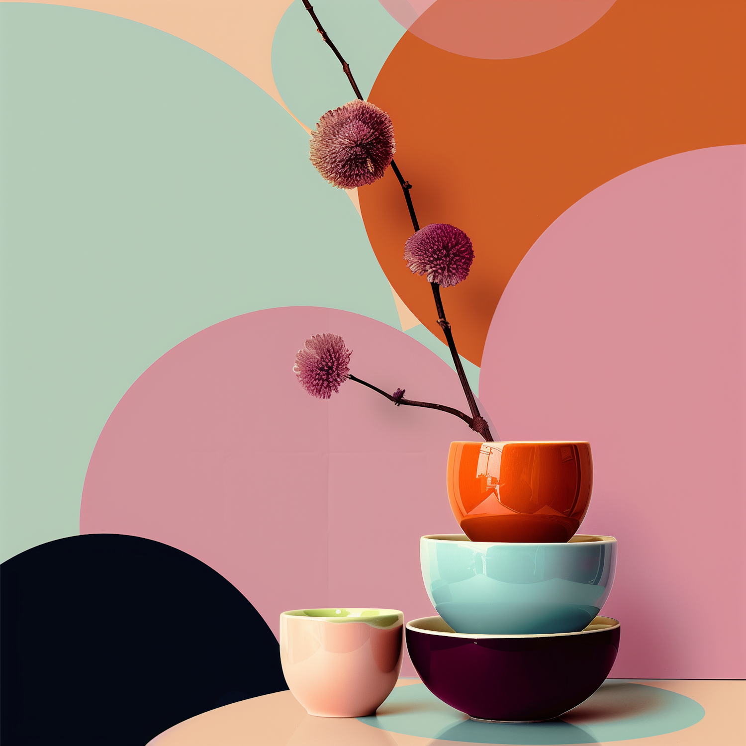Colorful ceramic bowls stacked with a branch of purple flowers against a vibrant, abstract background of pastel circles.