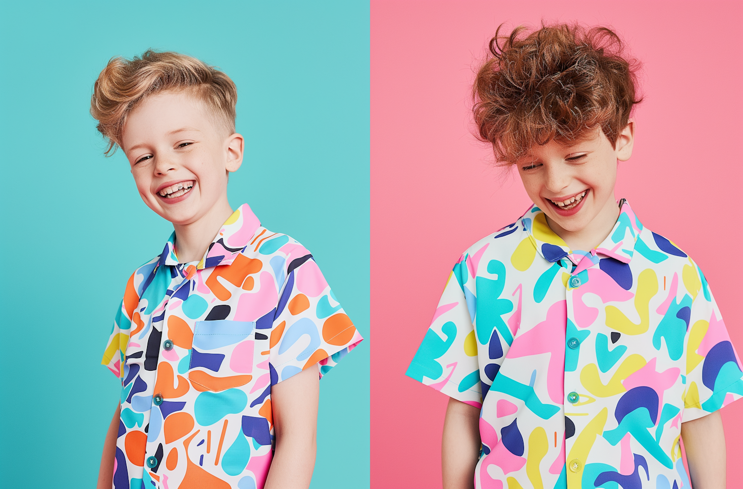 Two boys in vibrant, abstract-patterned shirts pose against turquoise and pink backgrounds, radiating playful energy and charm.