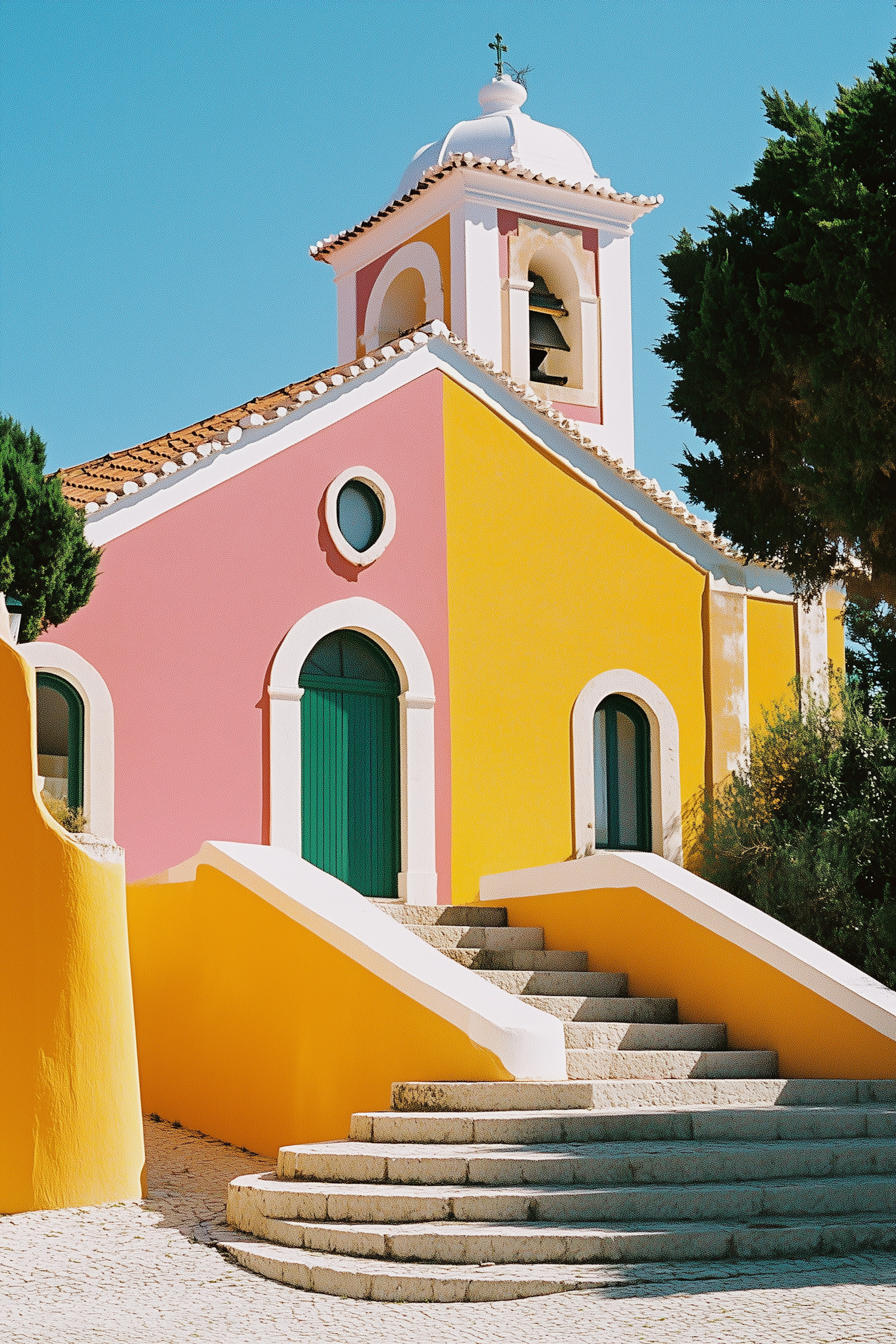 Vibrant yellow and pink building with green door, white trim, and bell tower under a clear blue sky, surrounded by lush greenery.