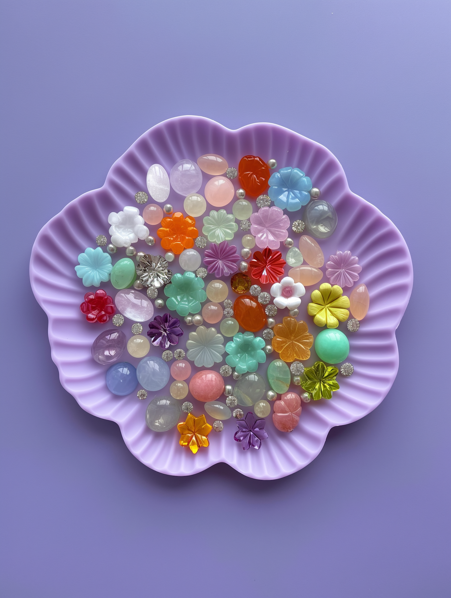 Colorful decorative stones on a lavender plate with scalloped edges, set against a purple background. Vibrant and visually appealing.