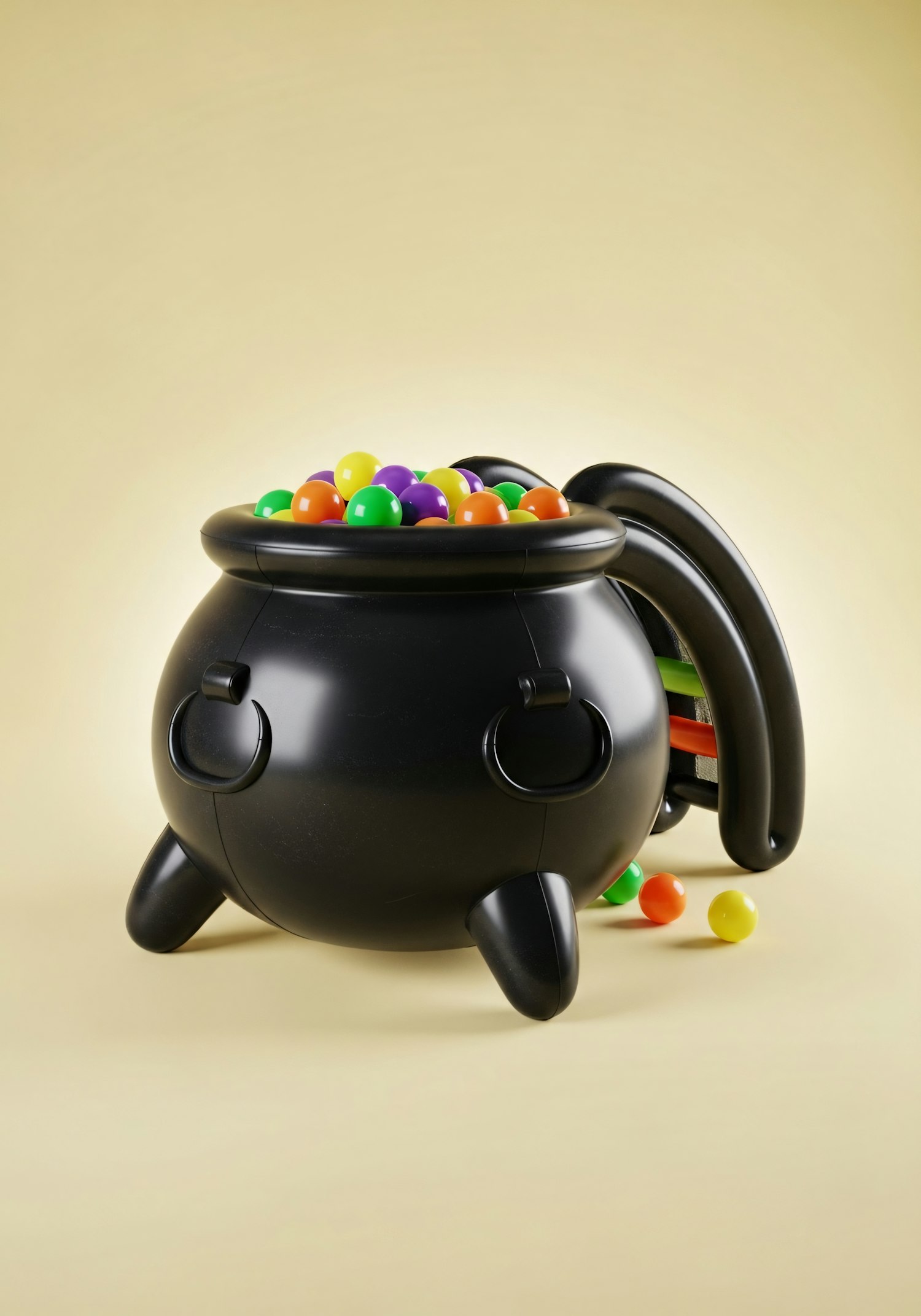 A black cauldron filled with colorful balls on a light yellow background, creating a playful and vibrant scene.
