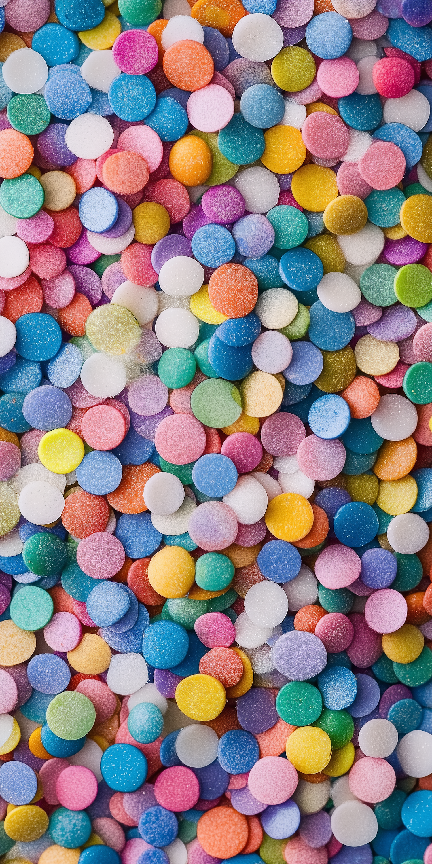 Bright and colorful close-up of round candies in pink, blue, yellow, and more, creating a playful and sweet visual treat.