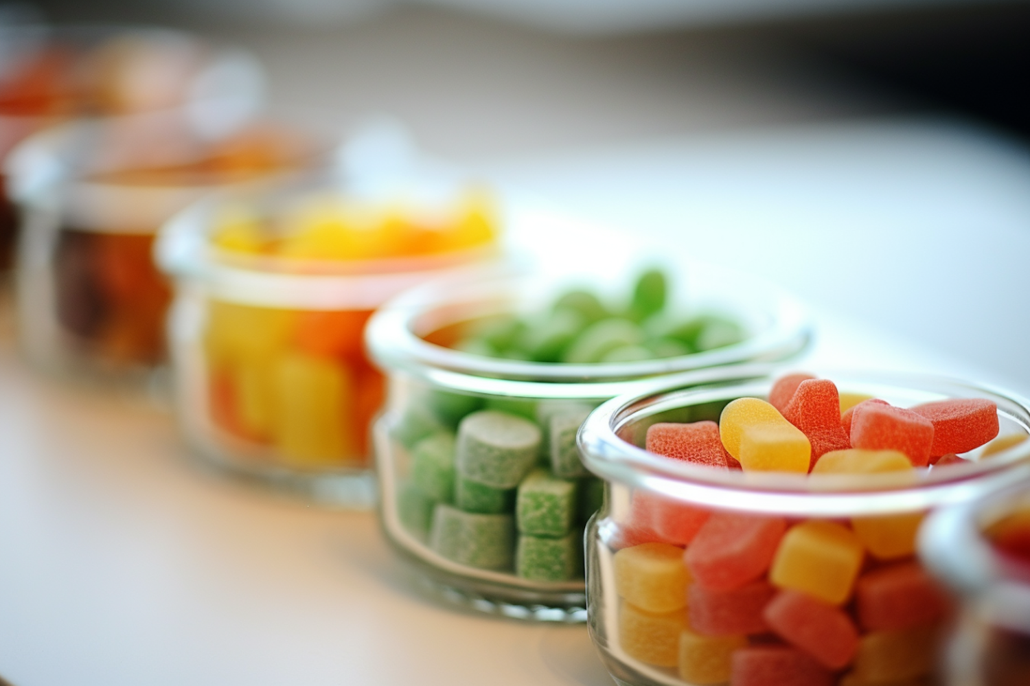 Colorful gummy candies in glass jars on a white surface, showcasing vibrant reds, yellows, and greens in a bright, appealing display.