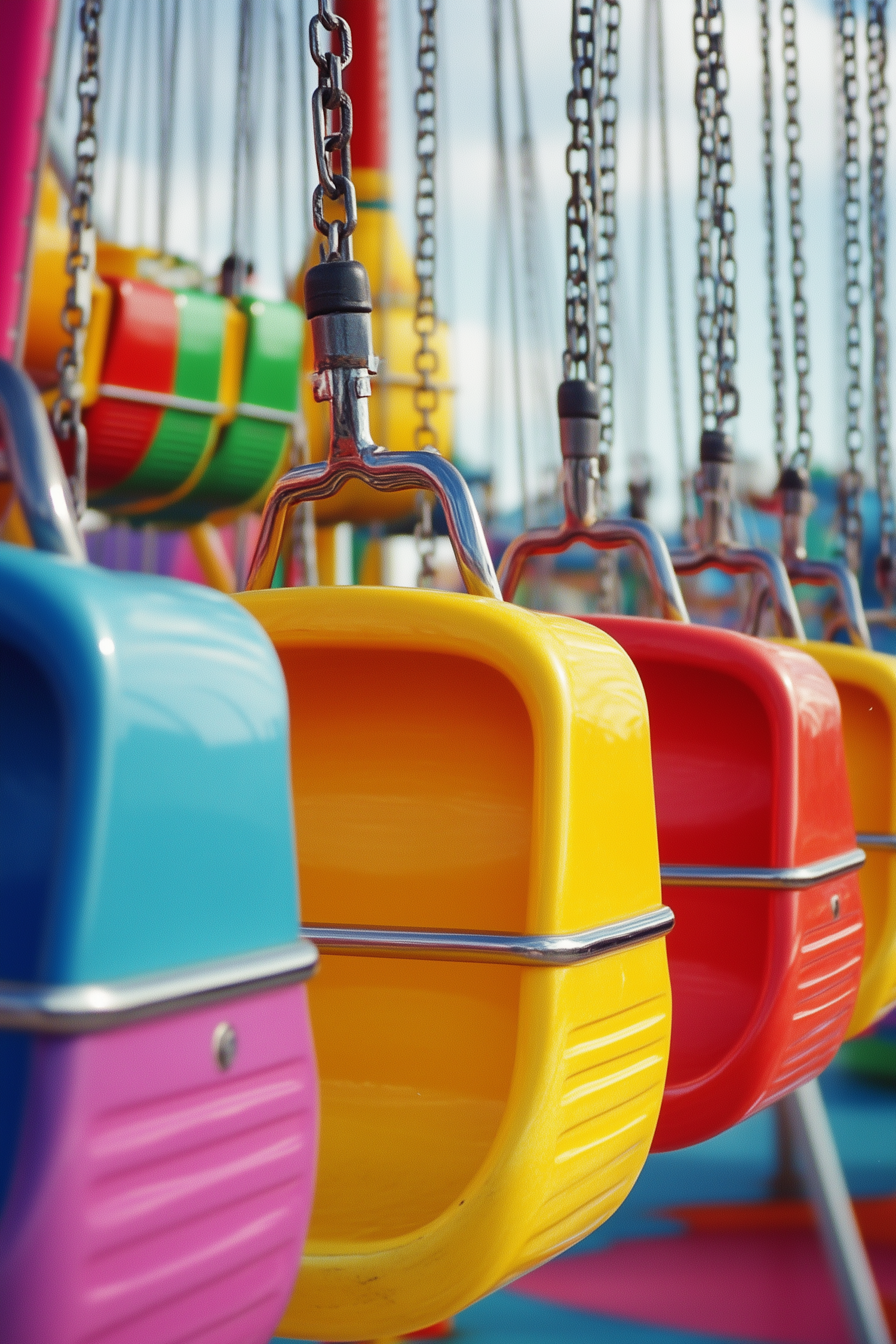 Colorful swing seats at an amusement park, featuring vibrant blue, yellow, and red hues, creating a lively and cheerful atmosphere.