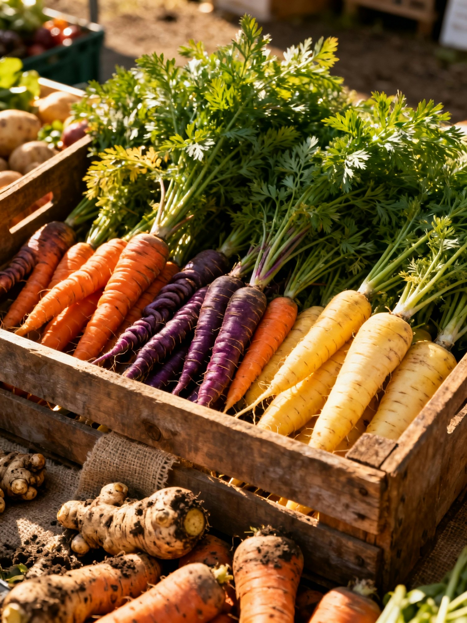 A rich, cinematic overhead view of a farmer’s market crate overflowing with carrots of all shapes and colors — twisted roots, deep purples, and sun-warmed oranges mingling beneath their feathery greens. The lighting is warm and natural, filtering through a soft haze to highlight the irregular beauty of each vegetable. The scene feels tactile, abundant, and honest — a celebration of imperfection and earth’s generosity.