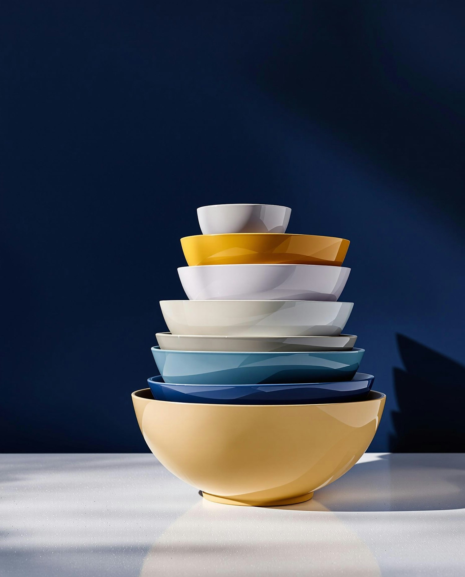 Stacked ceramic bowls in white, yellow, and blue hues on a white surface with a dark blue background, showcasing modern design and vibrant colors.