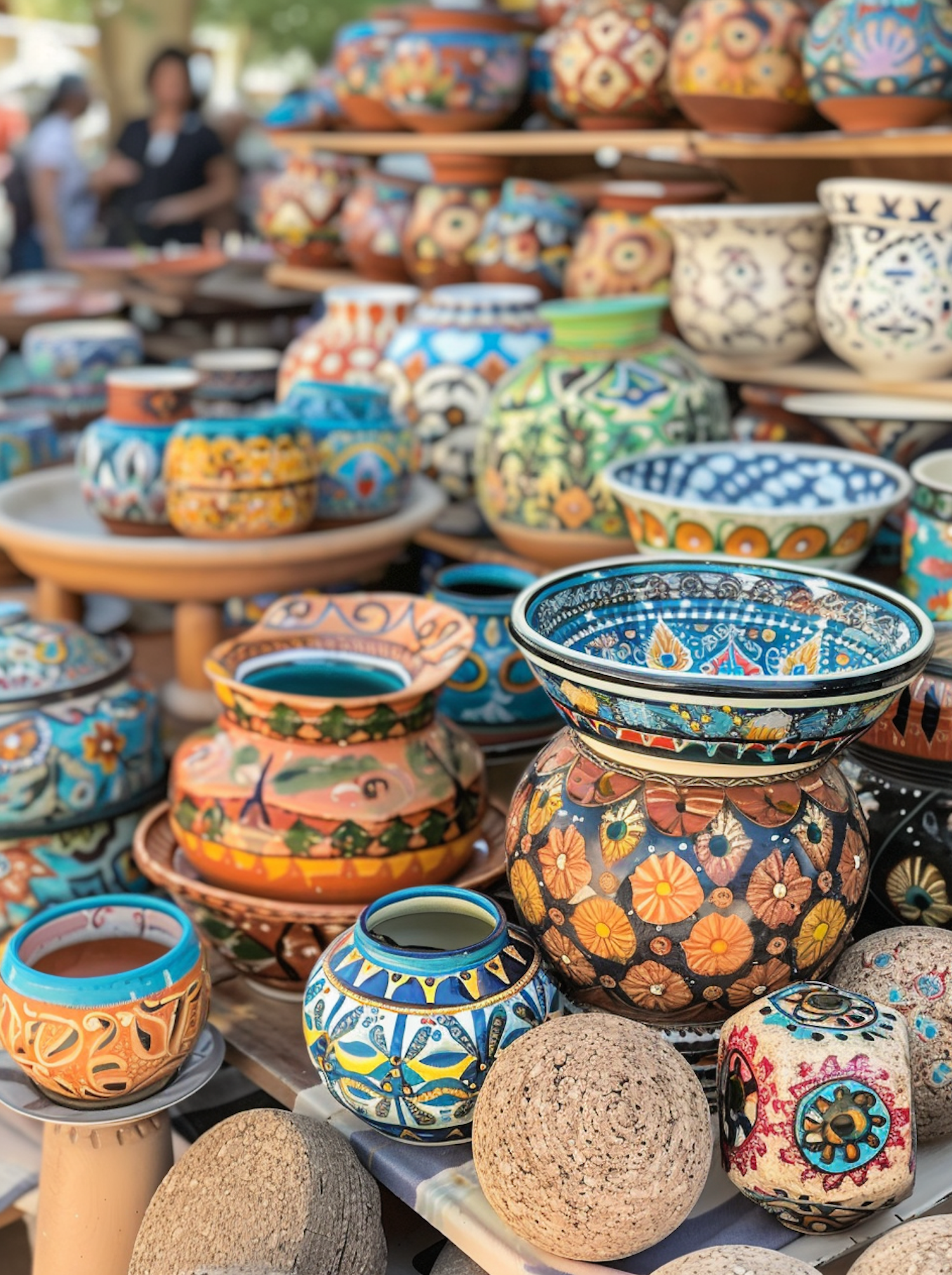 Colorful ceramic pots and bowls with intricate patterns on display at a market, showcasing vibrant designs and craftsmanship.