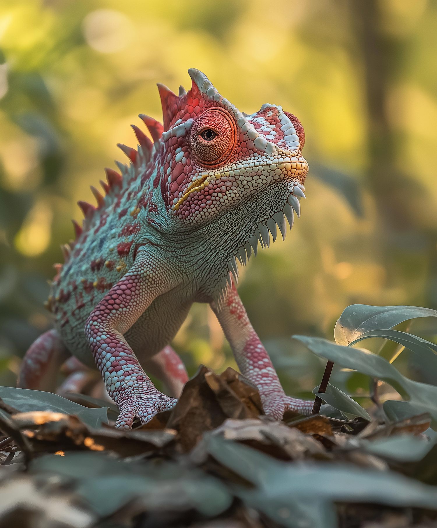 Colorful chameleon with red, green, and blue hues in a sunlit forest setting, showcasing its textured skin and expressive eyes.
