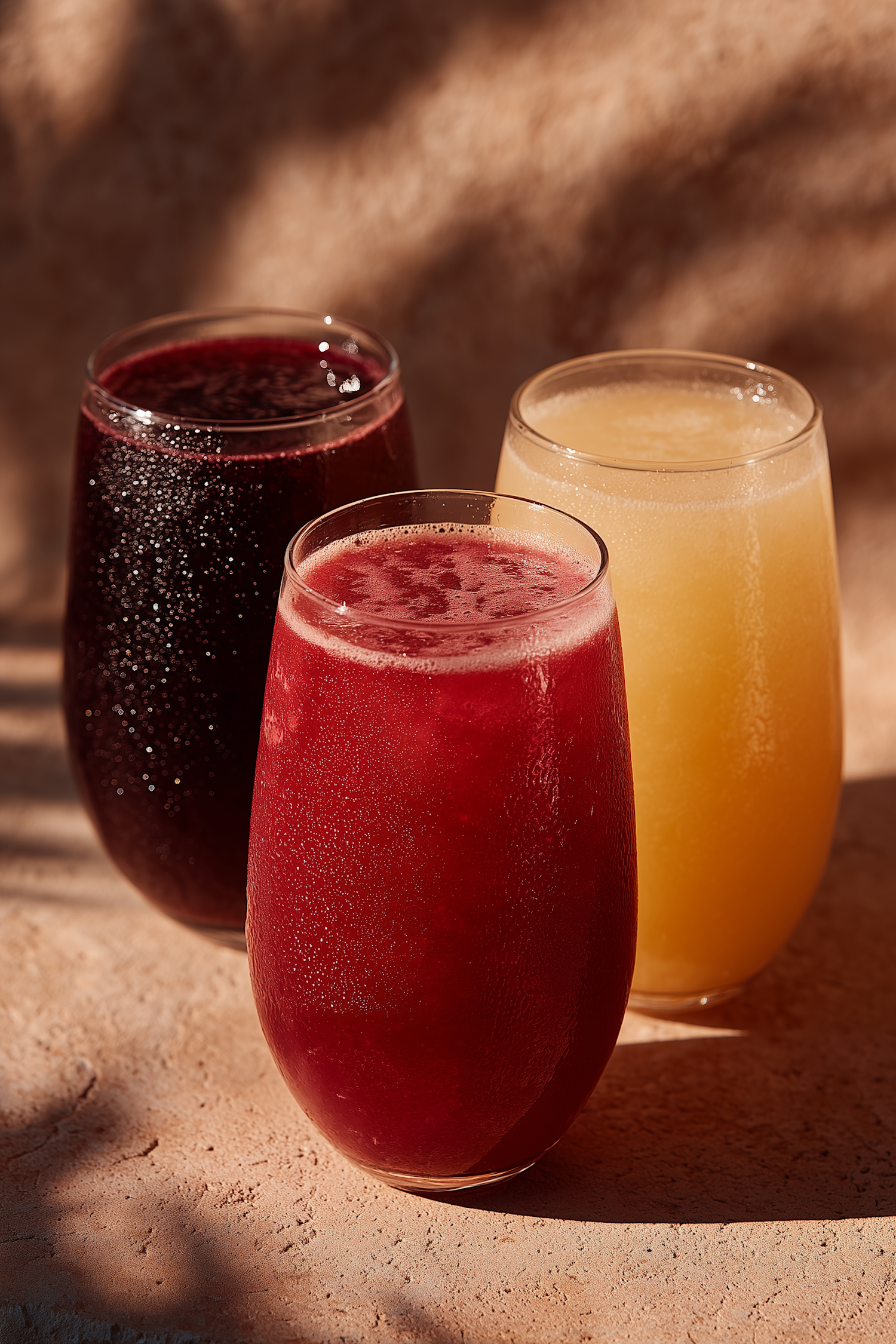 Three glasses of vibrant, chilled beverages in purple, red, and yellow hues, set against a warm, textured background.