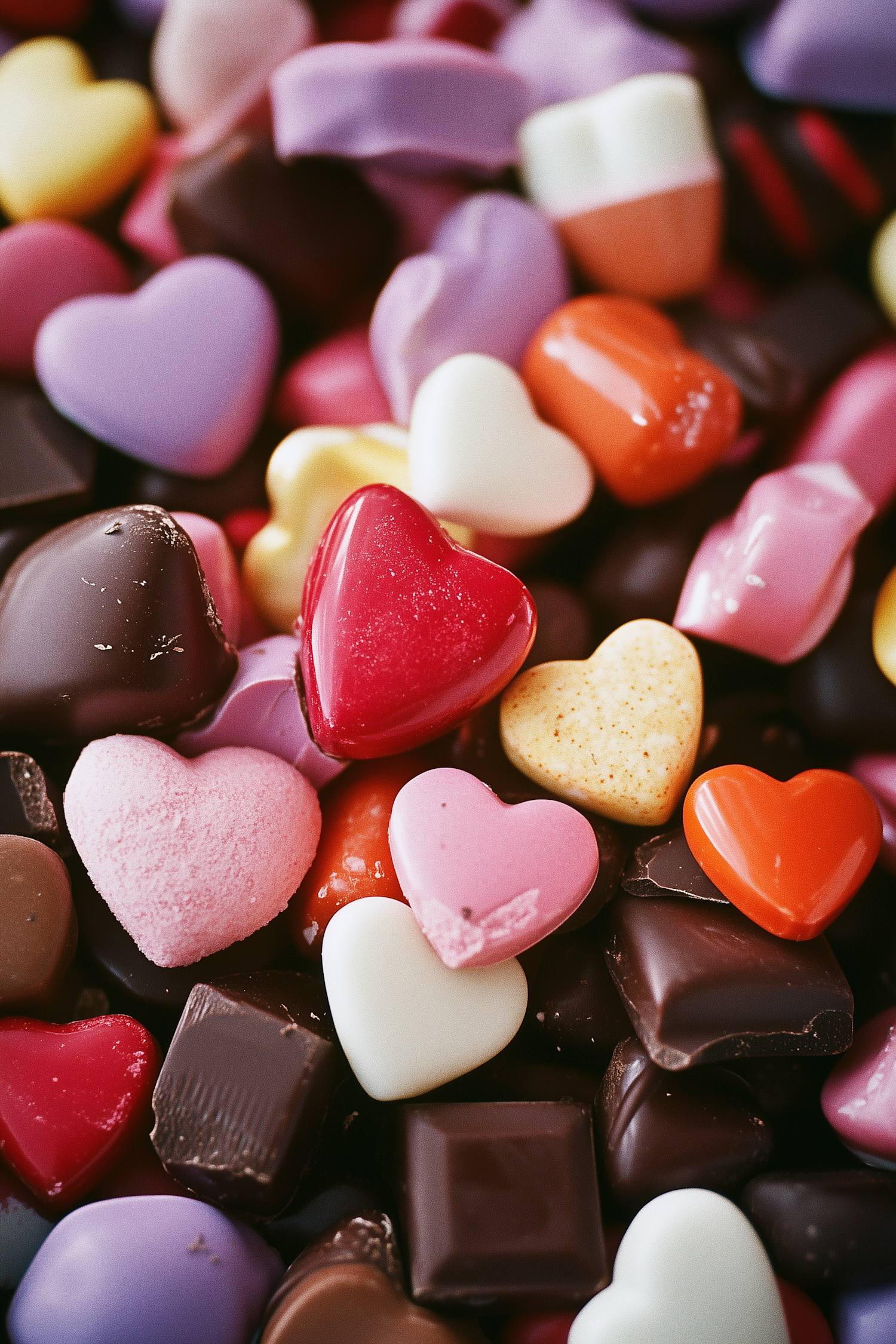 Colorful heart-shaped chocolates and candies in various hues, creating a vibrant and enticing display.