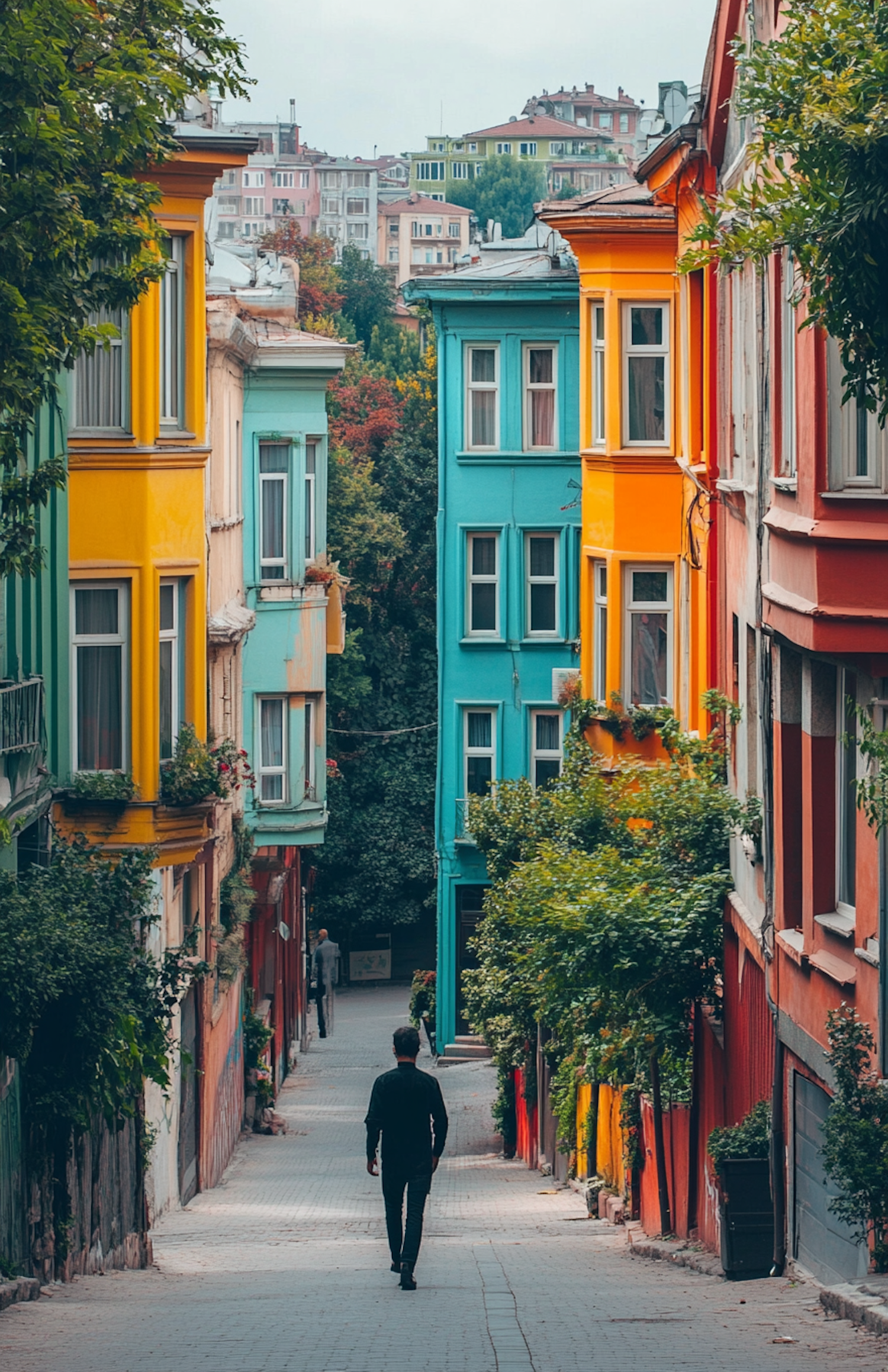 Colorful street with vibrant buildings and a man walking down a cobblestone path, surrounded by lush greenery and an overcast sky.