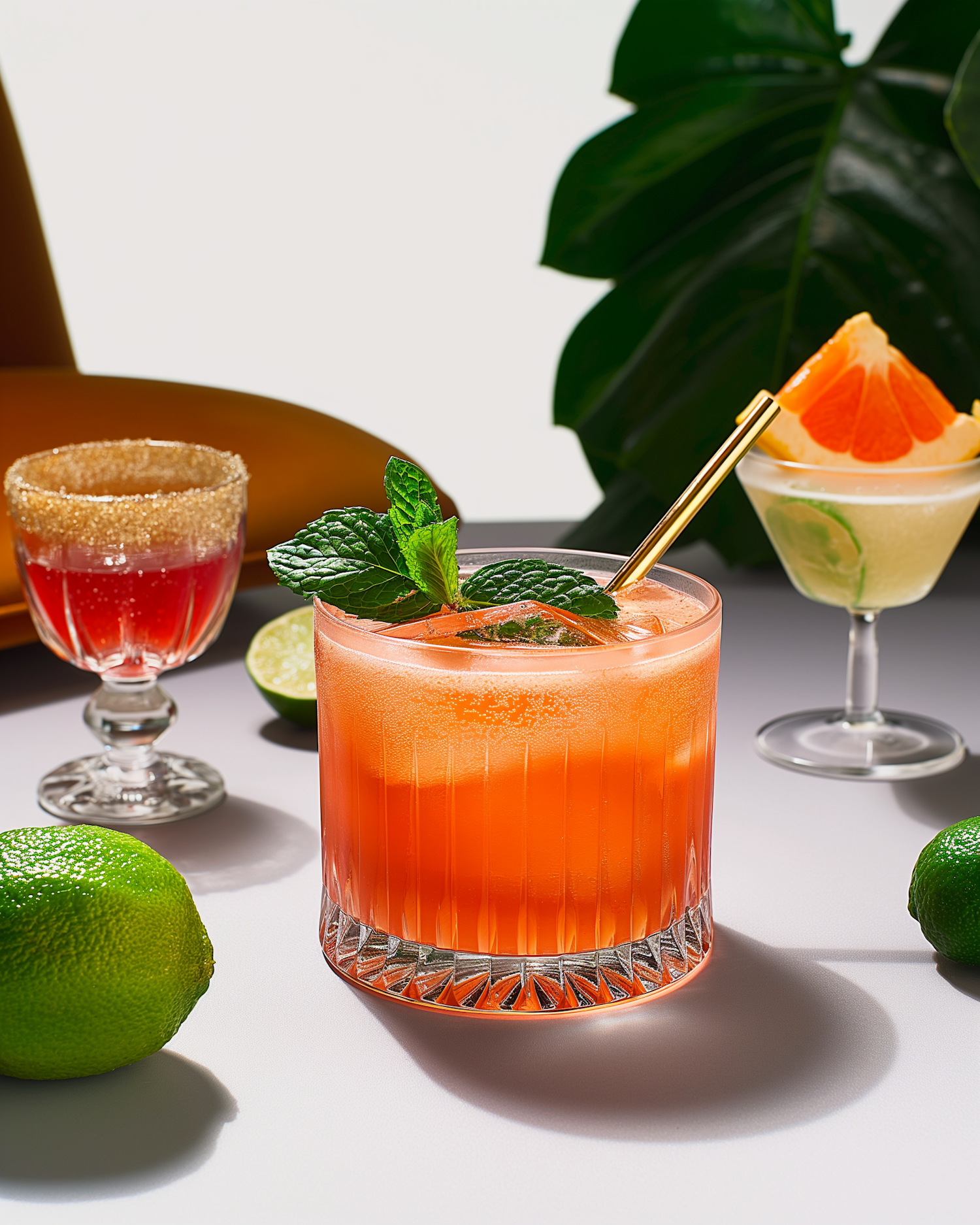 Bright orange cocktail with mint garnish, sugar-rimmed red drink, and grapefruit martini on a white table with tropical vibes.